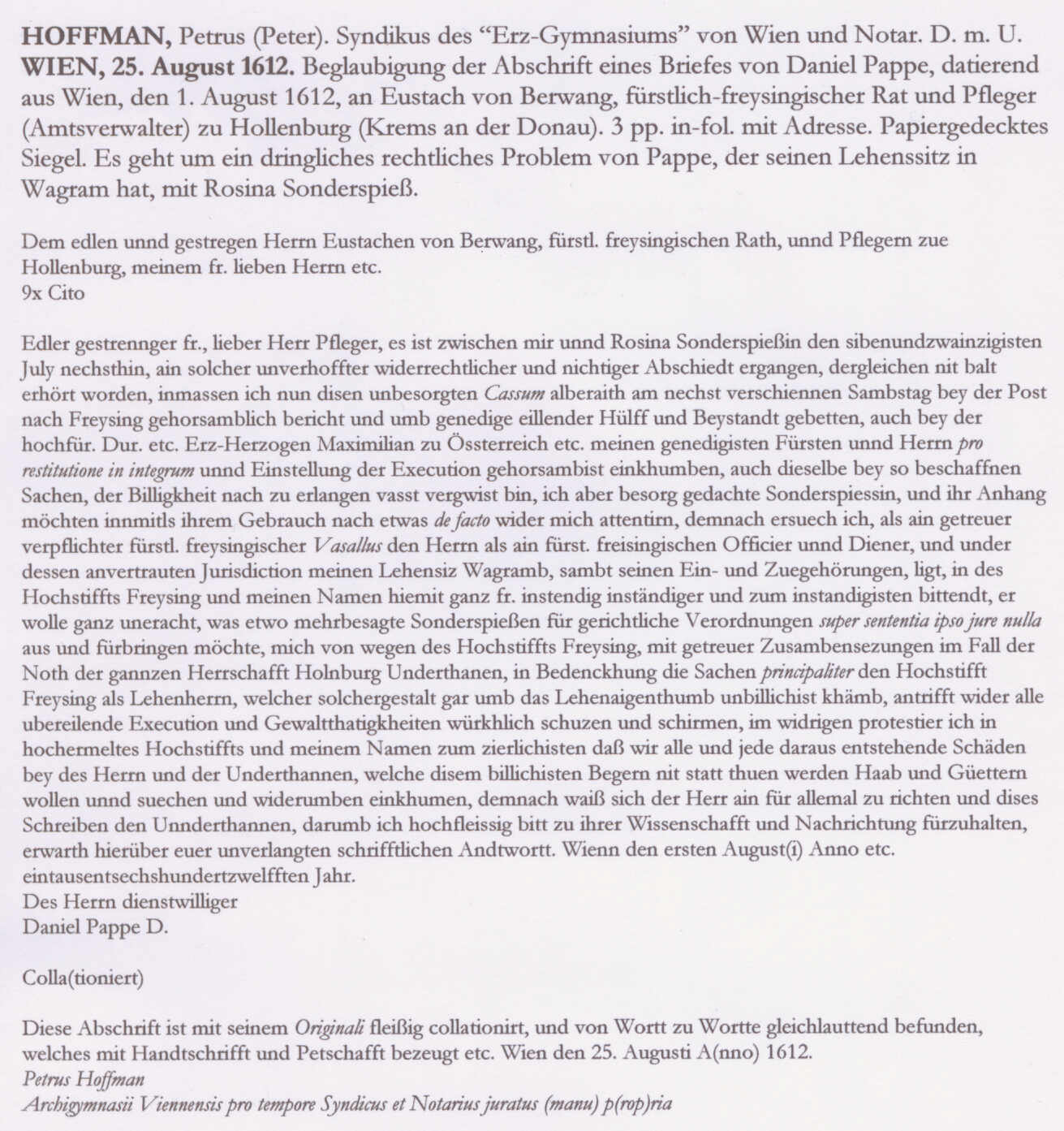 1040 on cover image1612, from Vienna to Hollenburg near Krems an der Donau, legal transcript certified by Petrus Hoffman notary and syndic of the Erz Gymnasium of Vienna, dated 25 August 1612, confirms the accuracy of a letter written on 1 August 1612 by Daniel Pappe to Eustach von Berwang princely Freyssing councillor and administrator of Hollenburg, concerns a legal dispute involving Rosina Sonderspeiß and Daniel Pappe regarding property and inheritance claims in Wagram, includes full legal citation and repetition of original wording, nine times CITO marking on address side indicating highest urgency, paper-sealed folded letter with complete chancery text, transmitted via the Imperial Court Post of Emperor Matthias under the direction of Karl Magno Imperial Postmaster in Vienna from 1612 to 1620, document reflects formal legal procedures in Habsburg lands during early 17th century legal centralization, XF! Estimate 1.200€.