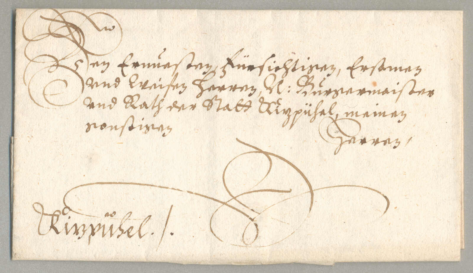 1033 on cover image1624, from Innsbruck to Kitzbühel, official folded letter dated 7 April 1624, sent by the tax collector Fröhlich, in service of the Landhauptmann an der Etsch, addressed to the mayor and council of the city of Kitzbühel, in response to a previous letter dated 5 April, informs the city authorities that the requested deferment of tax payments could not be granted, notes that although he had presented the matter to the Landhauptmann and attempted to assist, the court in Bozen was deemed responsible, written in chancery hand, mentions the complexities of jurisdiction and the limits of his influence, intact paper-covered wax seal on reverse, carried by the Ober- und Vorderösterreichische Hofpost administration during the joint tenure of Wolf Dietrich and Paul II. von Taxis, important document reflecting financial administration and communication between regional Habsburg authorities and urban centers in early 17th century Tyrol, VF Estimate 800€.