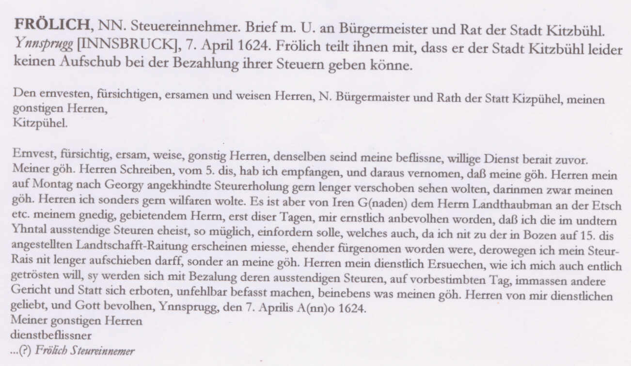 1624, ab Innsbrucker zu Kitzbühel, Amtsfaltbrief datiert 7 April 1624, gesendet von dem Nachtaxierung Sammler Fröhlich, im Dienst des Landhauptmann an der Etsch, gerichtet an den Bürgermeisters und Ratsversammlung der Stadt von Kitzbühel, in Erwiderung zu ein vorhergehend Brief datiert 5 April, informiert das Stadt Behörden jenes das aufgefordert Stundung von Nachtaxierung Zahlungen könnten nicht sein bewilligt, Noten jenes obwohl er hatte präsentiert das Angelegenheit an die Landhauptmann und versuchter assistieren, das Gericht in Bozen war erachtet verantwortlichen, geschrieben in Kanzleischrift, erwähnt das complexities von Gerichtsstand und die limitiert von seiner beeinflussen, unbeschädigt paper-covered Wachssiegel auf der Rückseite, befördert durch den Ober- und Vorderösterreichische Hofpost Verwaltungs während der gemeinsamem Amtszeit von Wolfes Dietrich und Paul II. Von Taxische, wichtig Dokument abspiegelnd finanziell Verwaltungs und Kommunikation zwischen Regional- habsburgischen Behörden und kommunal zentriert im frühen 17. Jahrhundert Tirol, Pracht Schätzpreis 800 EUR.