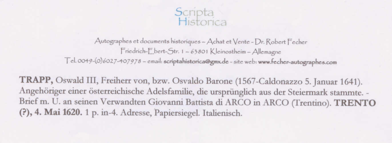 1032 on cover image1620, from Trento to Arco, folded letter dated 4 May 1620 from Freiherr Oswald III. Trapp to his relative Giovanni Battista di Arco, written in Italian, sent under the administration of the imperial hereditary post office in Trento operated by Ferdinand Karl Bordogna von Taxis, single paper seal intact on reverse, sent during a period of administrative restructuring and debt settlement in the region of Trentino, early example of noble correspondence within the extended Trapp family, historically linked to Styrian nobility, minor folds and aging consistent with early 17th century paper, VF-XF! Estimate 600€.