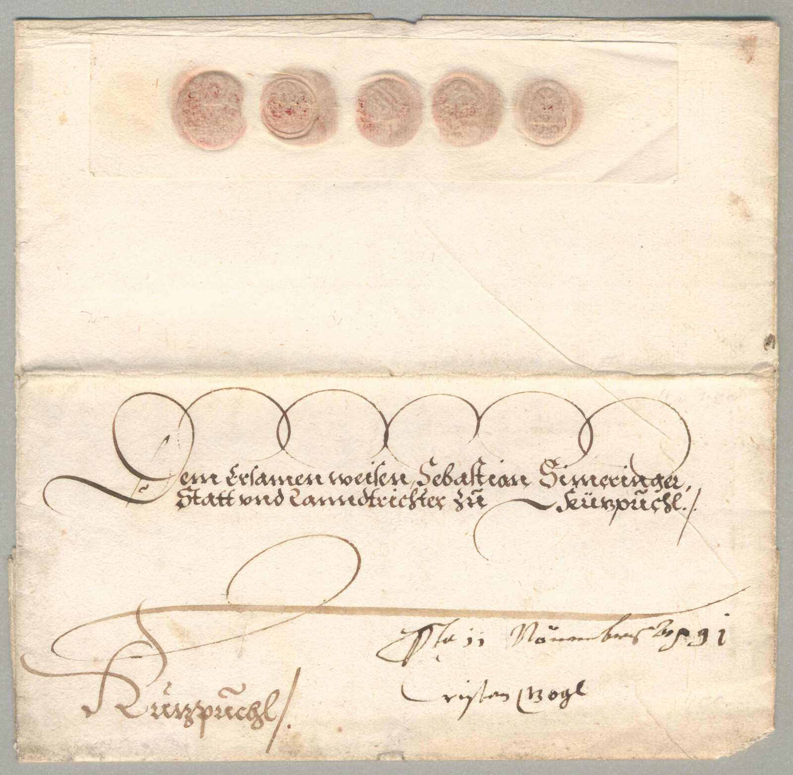 1031 on cover image1591, from Innsbruck to Kitzbühel, official letter from the government of Archduke Ferdinand II of Austria, dated 6 November 1591, addressed to Sebastian Simmeringer, town and district judge of Kitzbühel, folded chancery style letter concerning a legal dispute between a couple from Unter Grünbach and the parish of St. Peter in Kössen, complete with five paper covered seals on reverse instead of signatures, minor paper faults noted, transported via regular post to St. Johann and from there by messenger to Kitzbühel, includes clear date line and full name of the recipient, historical context reflects early Tyrolean judicial and administrative processes under Ferdinand II, early usage of formalized court instructions within regional governance, VF Estimate 800€.