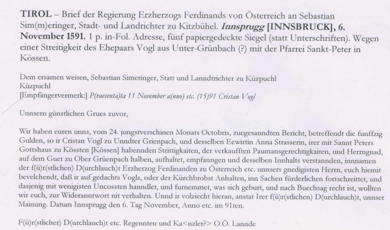 1591, ab Innsbrucker zu Kitzbühel, Amtsschreiben von der Regierung von Erzherzog Ferdinand II Osterreichs, datiert 6 November 1591, adressiert nach Sebastian Simmeringer, Ort und Bezirksrichter von Kitzbühel, gefaltet chancery Ausführung Brief betreffend ein rechtliche Streitfrage zwischen einigen ab Unter Grünbach und die Pfarrei von HL. PETRUS in Kössen, komplett mit fünf papierbedecktem Siegel auf der Rückseite statt Signaturen, kleinere Papierbeanstandungen dabei, befördert über ordnungsgemäß post zu St. Johann und von dort aus durch Boten zu Kitzbühel, beinhaltet klare Datumszeile und volles name des Empfänger, historischen Zusammenhange reflektiert frühe tirolerisch Justiz und administrativer Abläufe unter Ferdinand II, Frühverwendung von formalisiert Gericht Anleitungen innerhalb Regional- Herrschaft, Pracht Schätzpreis 800 EUR.