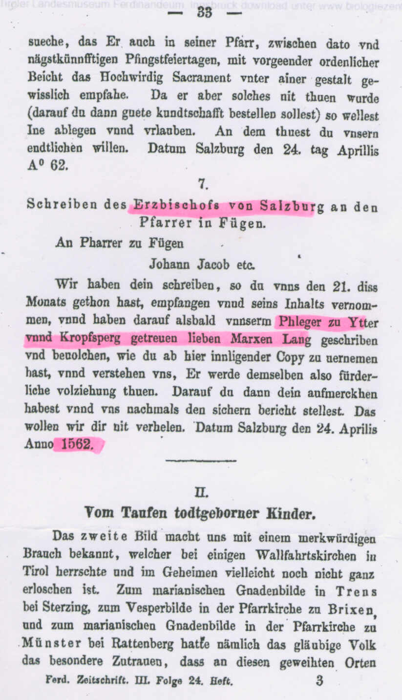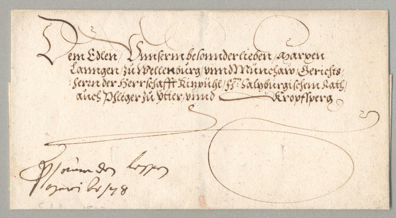 1028 on cover image1578, from Salzburg to Kropfsberg near Jenbach, folded letter addressed to Marxen Langgen, court official and caretaker in Ytter and Kropfsberg, representing the Archbishopric of Salzburg, official correspondence in chancery hand, carries a small red embossed seal on reverse featuring a bishops mitre, crosier, and alliance coat of arms, historical context links sender to Archbishop Johann Jakob von Kuen-Belasy of Salzburg, who ruled from 1560 to 1586, rare early ecclesiastical correspondence documenting administrative matters within Salzburgs territorial governance, excellent clarity and historical attribution through handwriting and seal, F-VF Estimate 600€.