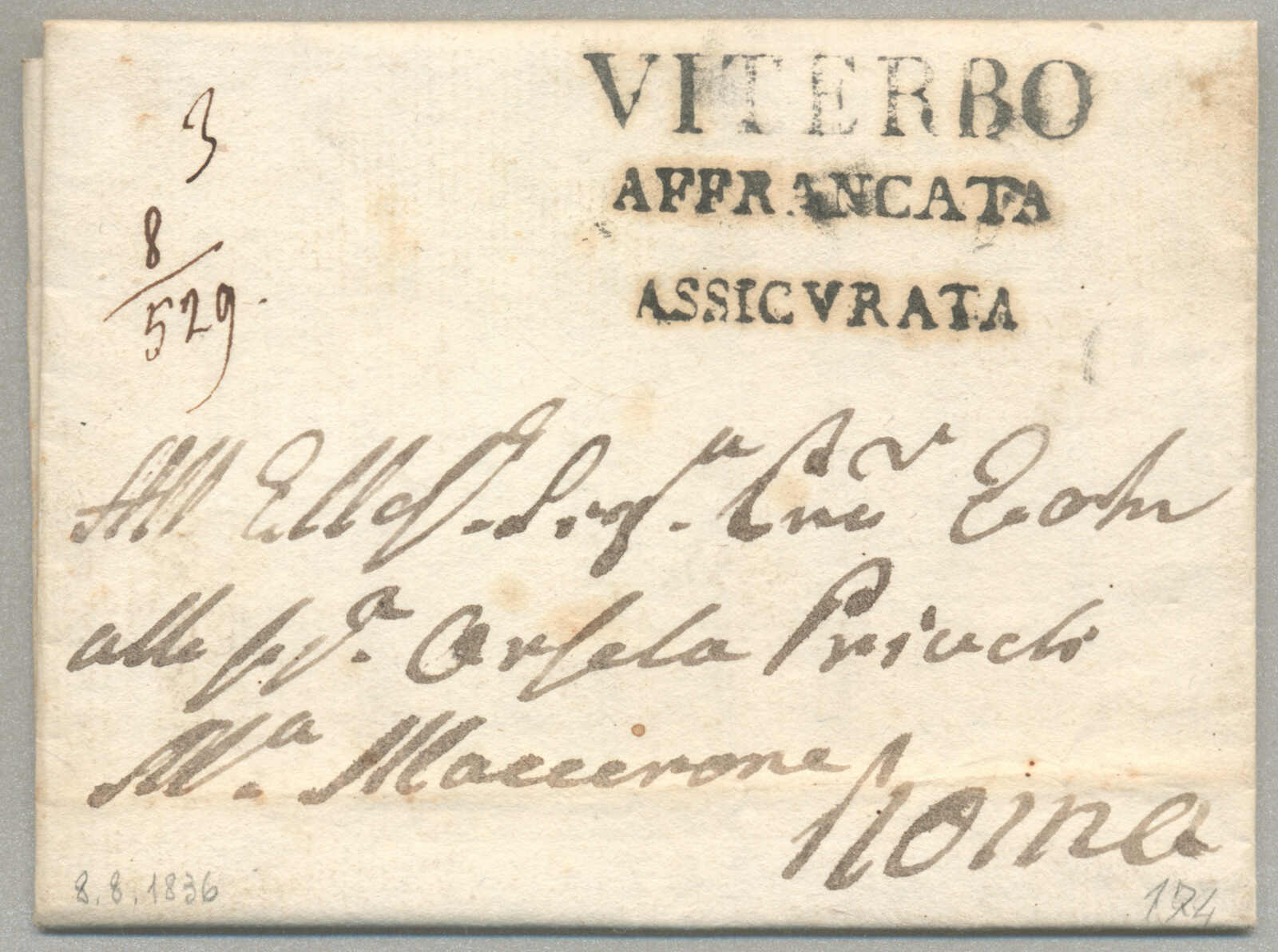 1836, mit sauberem Abschlag des Viterbo, auf Faltbrief, ex Provera, Kabinett! Schätzpreis 700 EUR.