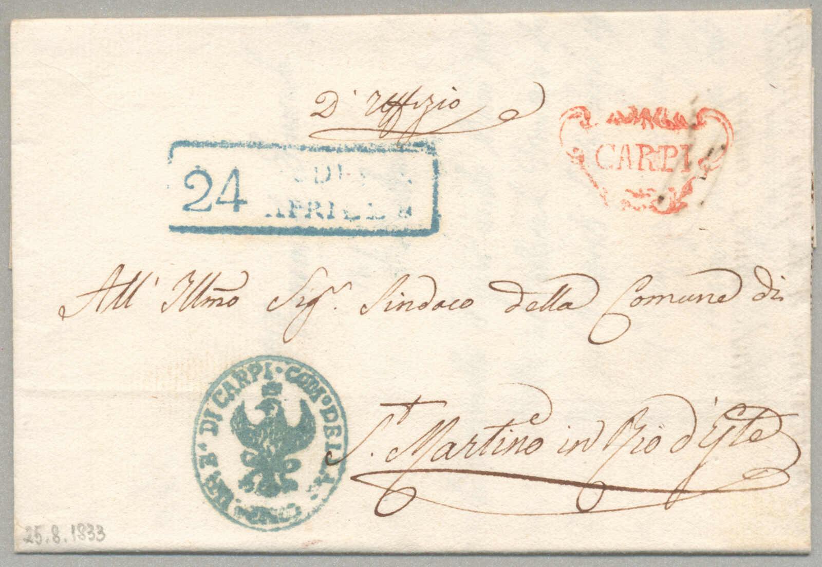 1833, mit sauberem Abschlag des Carpi, auf Faltbrief, ex Provera, Kabinett! Schätzpreis 120 EUR.