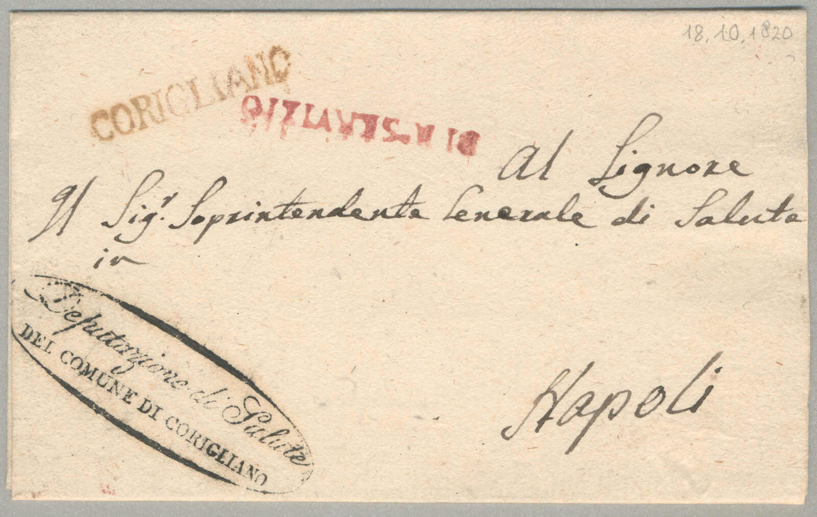 1820, mit sauberem Abschlag des Corigliano, auf Faltbrief, ex Provera, Kabinett! Schätzpreis 160 EUR.