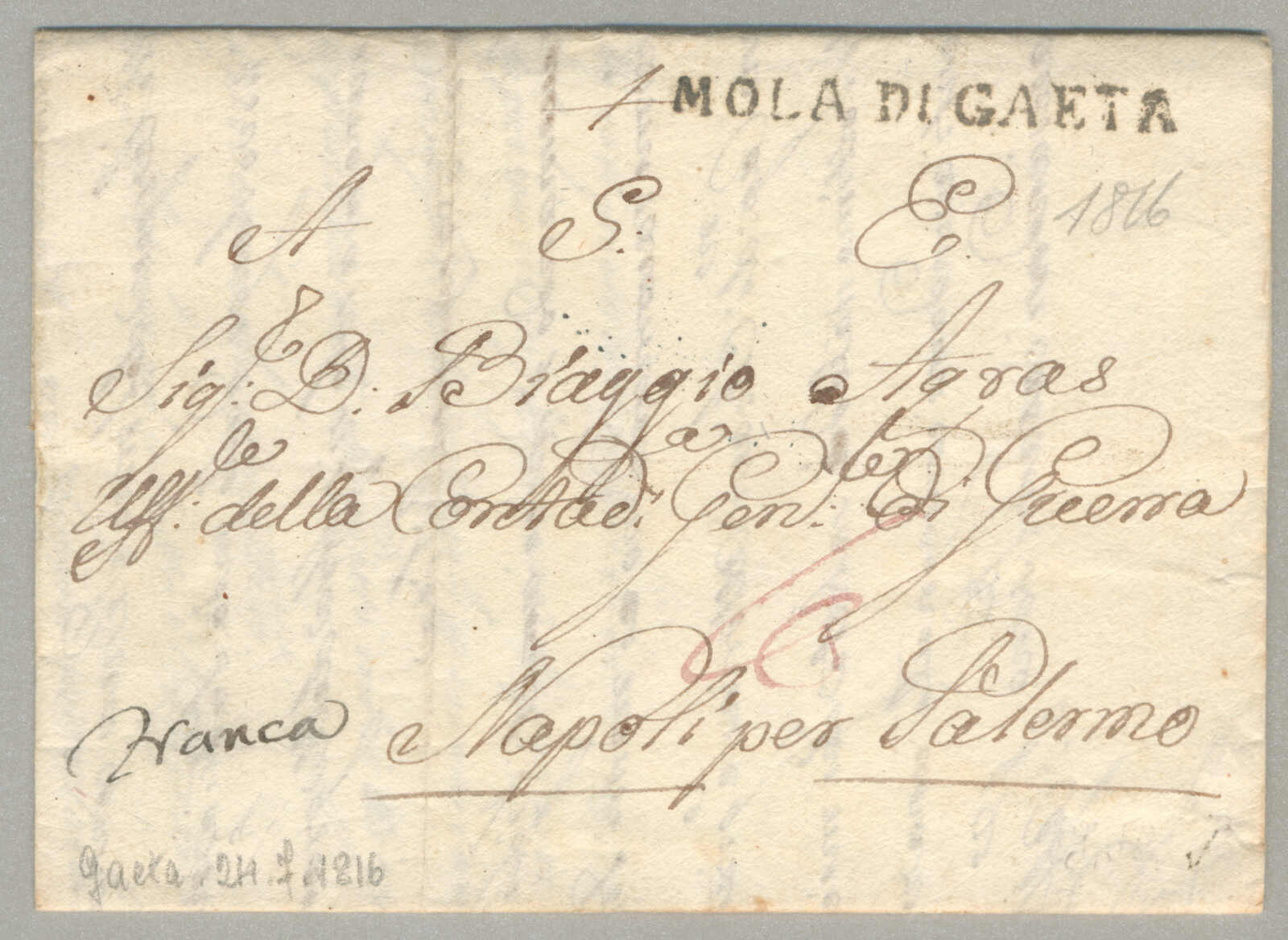 2767 on cover image1816, with neatly strike of Mola di Gaeta, on folded letter, ex Provera, XF! Estimate 120€.