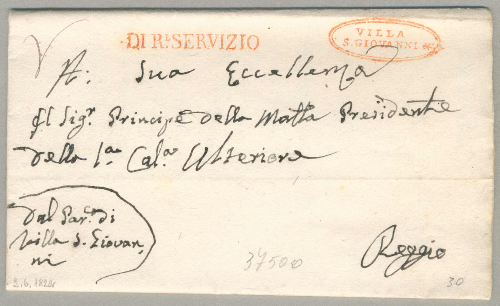 2829 on cover image1820, with neatly strike of Villa S. Giovanni, on folded letter, ex Provera, XF! Estimate 120€.