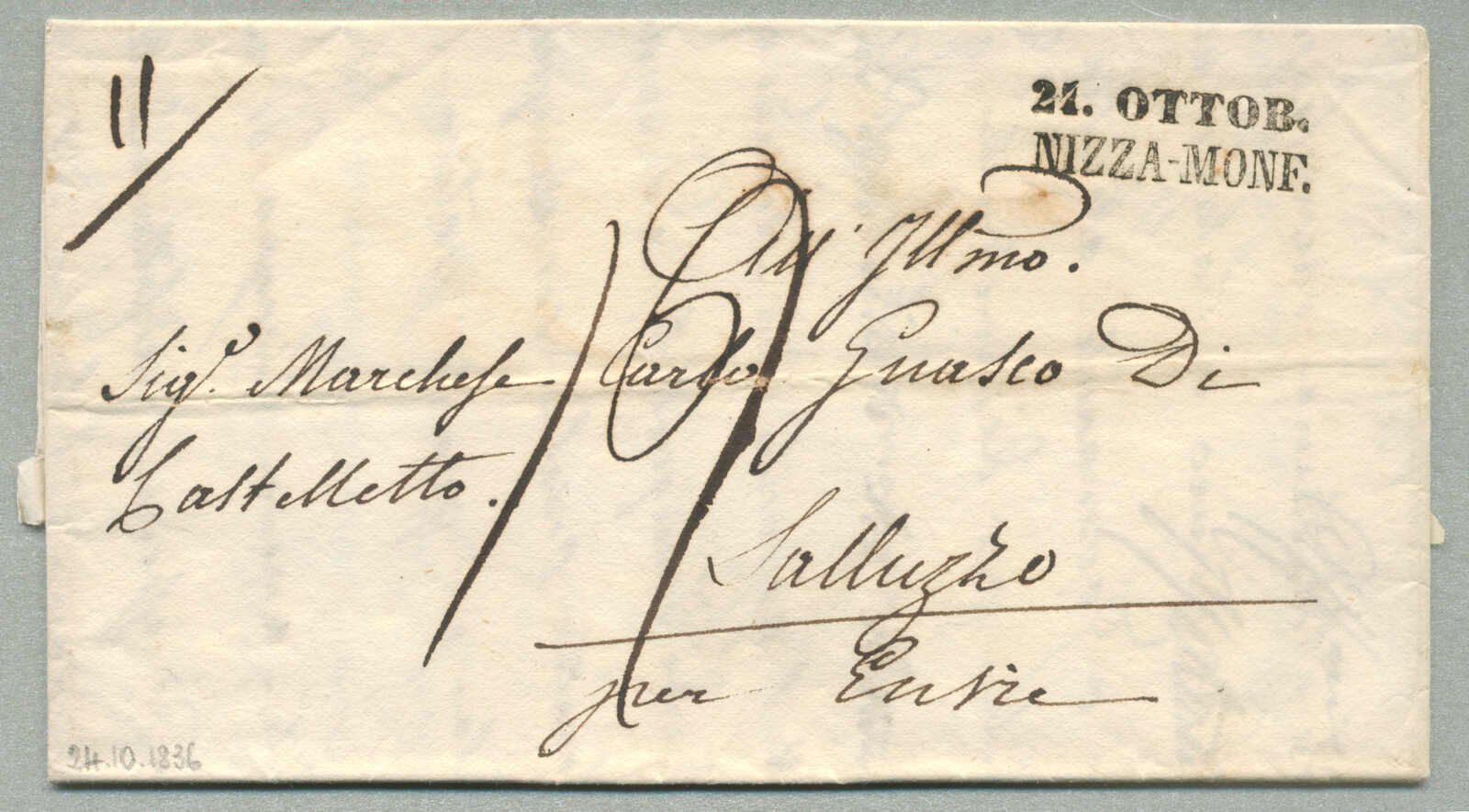 2922 on cover image1836, with neatly strike of Nizza Monf., on folded letter, ex Provera, XF! Estimate 100€.