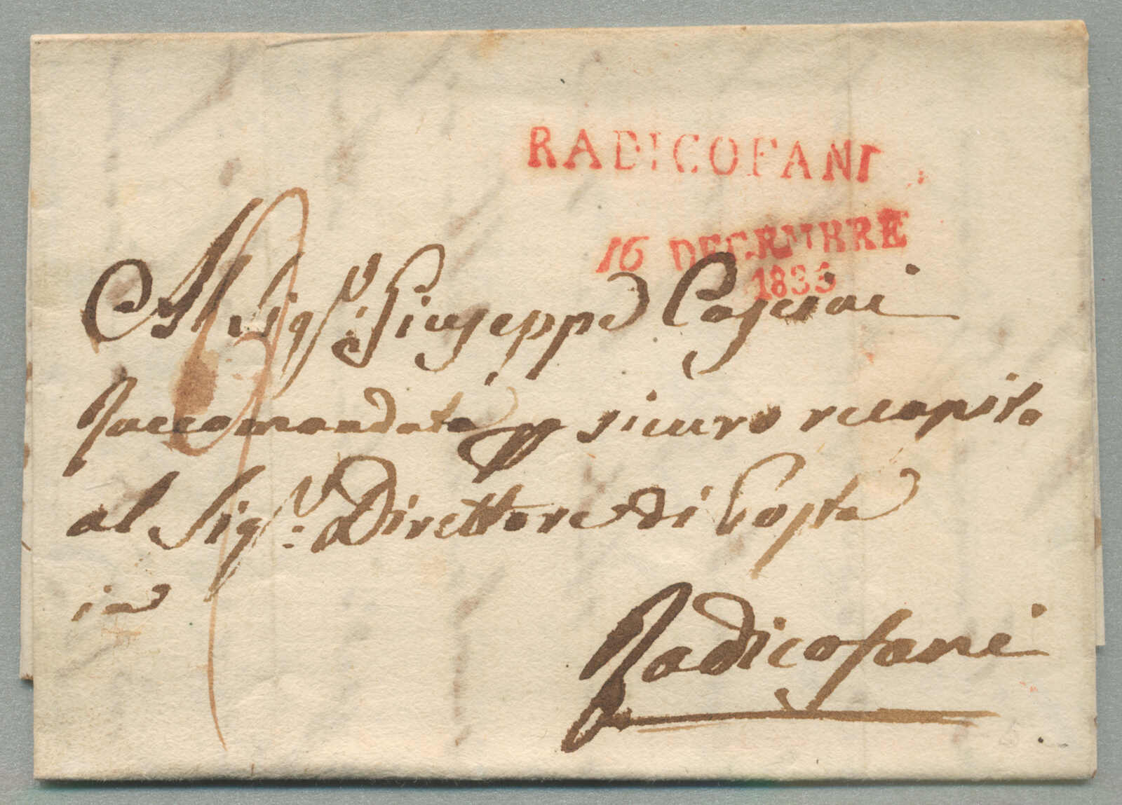 1833, mit sauberem Abschlag des rot Radicofani, auf Faltbrief, ex Provera, Kabinett! Schätzpreis 100 EUR.