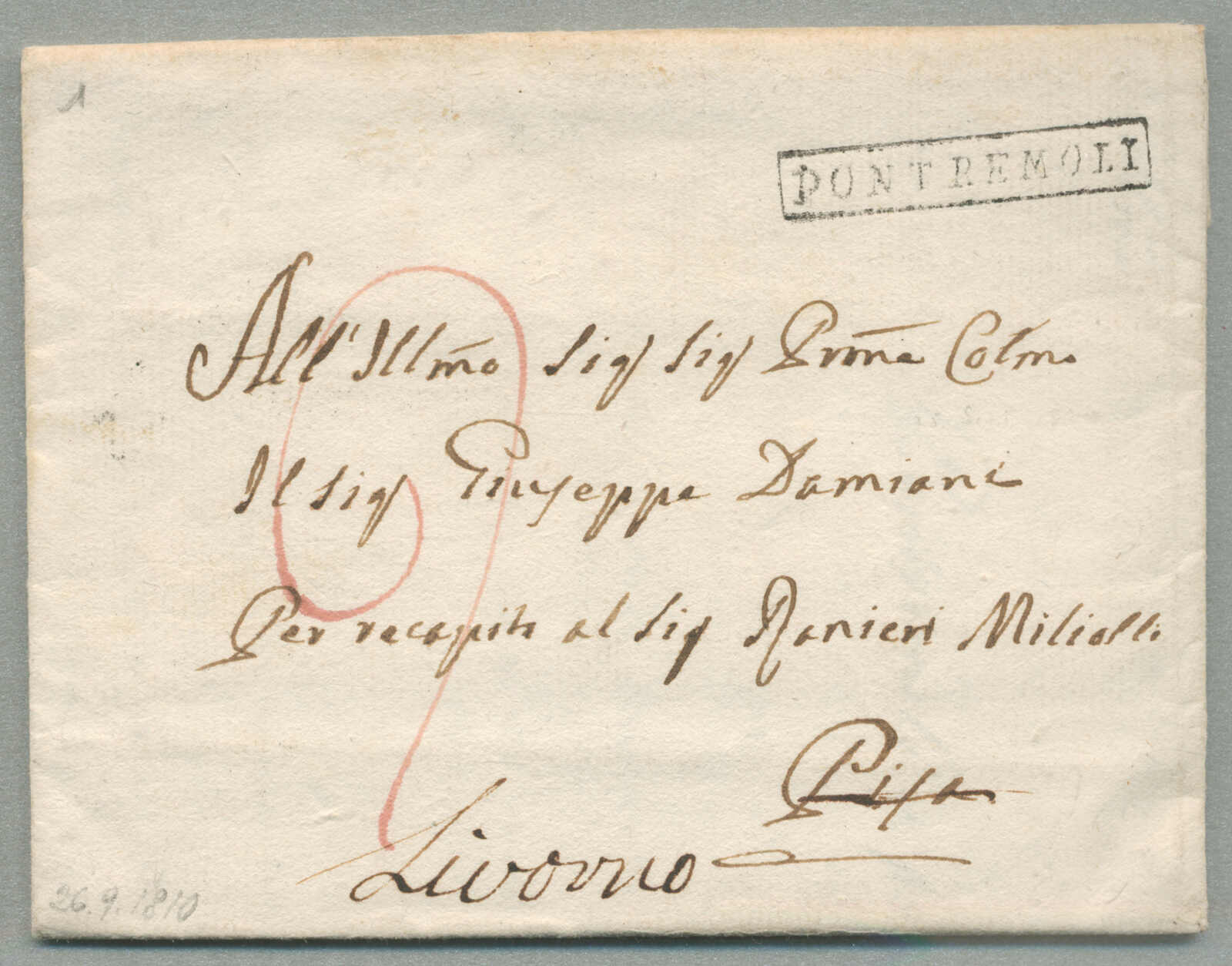 1810, mit sauberem Abschlag des Pontremoli, auf Faltbrief, ex Provera, Kabinett! Schätzpreis 160 EUR.