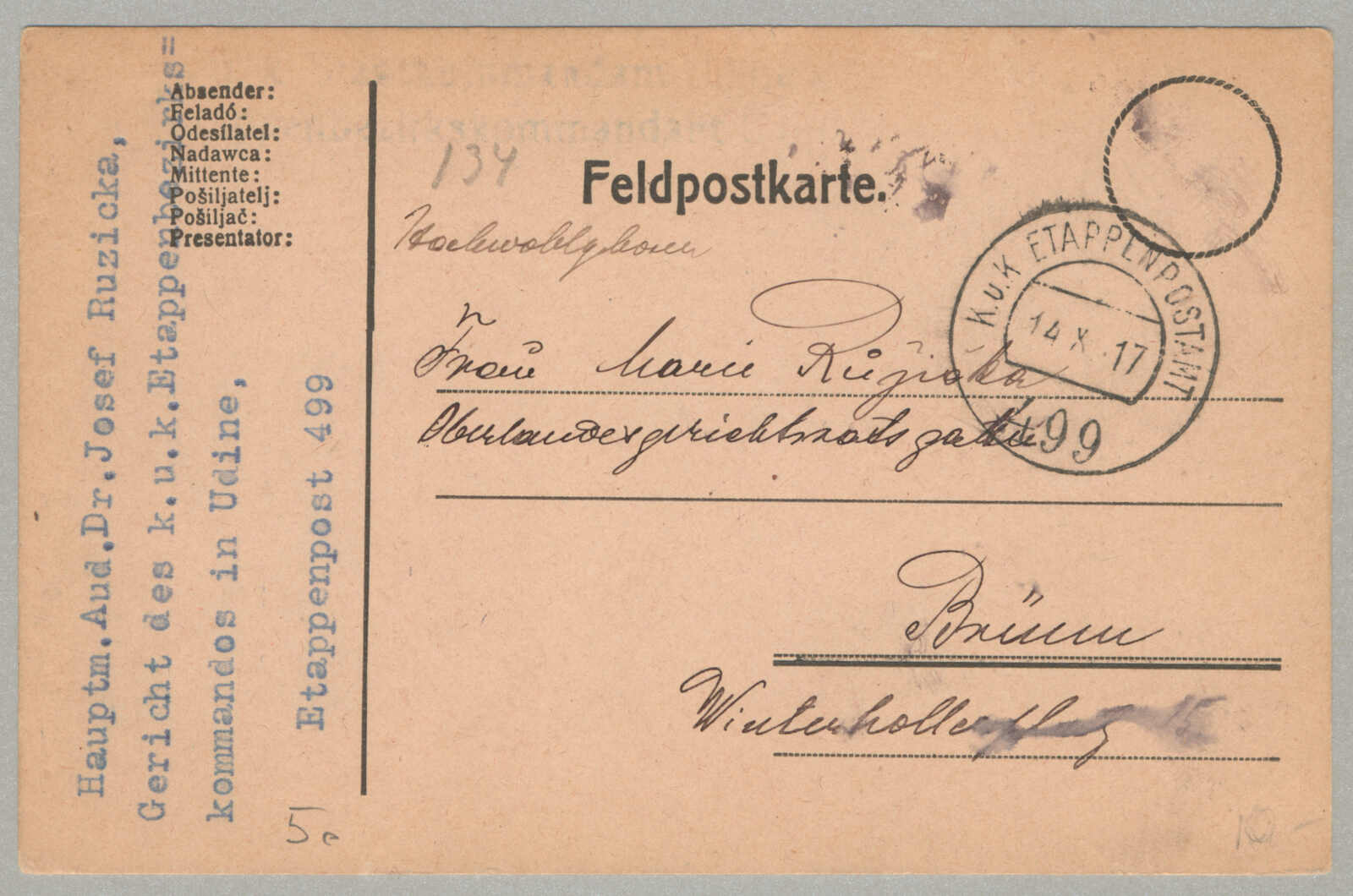 2242 on cover image1917, from k.u.k. Etappenpostamt 499 to Brünn, Austrian military field postcard sent by Hauptmann Auditor Dr. Josef Ruzicka, Gericht des k.u.k. Etappenkommandos in Udine, addressed to Maria Riegrova, handwritten address and message, black circular postmark K.U.K. ETAPPENPOSTAMT 499 dated 14.X.17, violet handstamp K.u.k. ETAPPENGERICHT Udine partially visible on card, usage from rear-area military administration during the Austro-Hungarian occupation of northern Italy following the 12th Battle of the Isonzo and the advance into Italian territory, historical significance as part of military legal system operations behind the front lines, ex Kugel, XF! Estimate 400€.