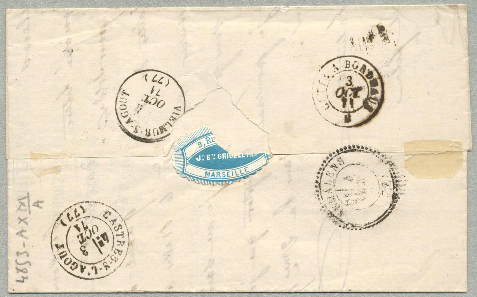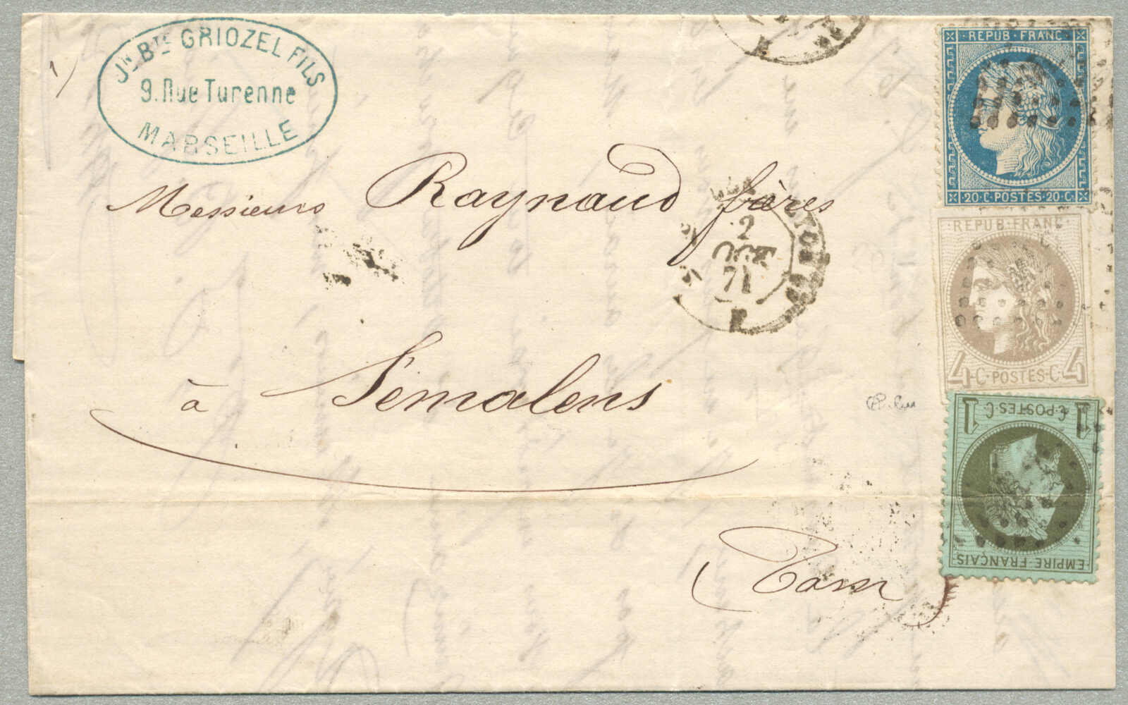 2270 on cover image1871, From Marseille to Semalens, letter franked with 1x 20 c blue Ceres, 1x 4 c gray Ceres, and 1x 5 c green Napoléon laureate issue, all imperforate, cancelled with circular date stamp MARSEILLE 2 OCT 71, multiple transit and arrival backstamps including CASTRES, VILLENEUVE S LOT, and SEMALENS dated 3 and 4 OCT 71 on reverse, blue sender cachet J.Bt GRIOZEL FILS MARSEILLE on front and back, interesting mixed franking of Empire and Ceres issues during transitional Third Republic period, rate suggests second weight class or combined franking of older and new issues, clear to good margins, scarce combination, XF! Estimate 400€.