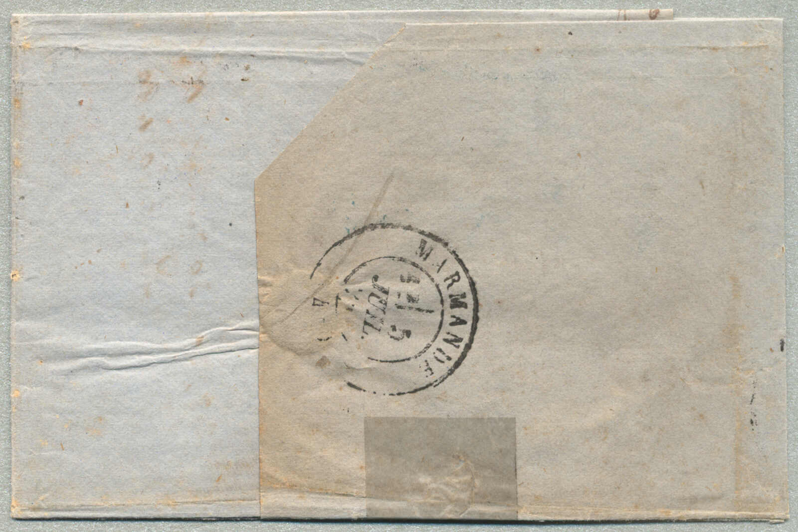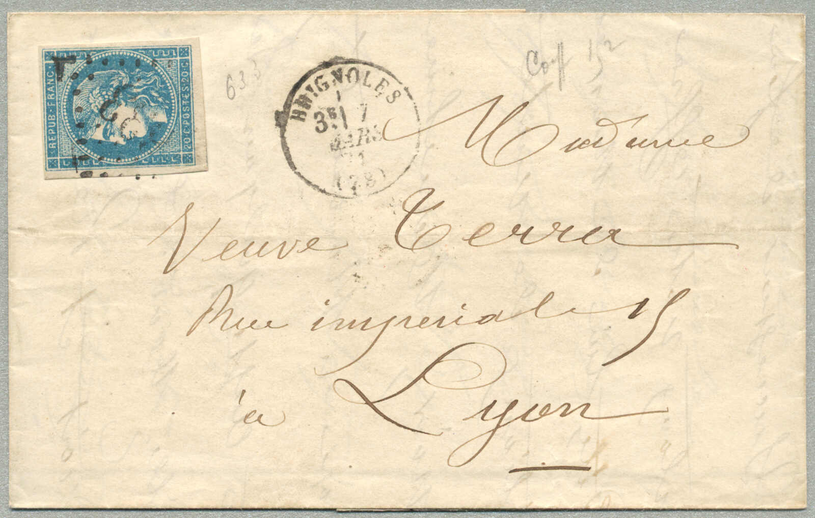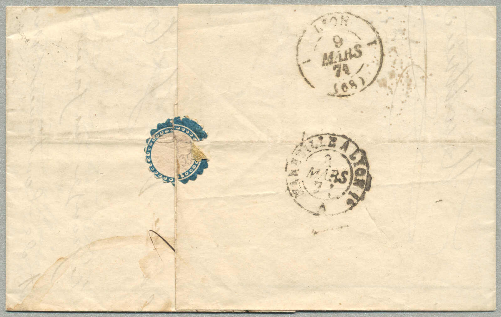 2262 on cover image1871, From Brignoles to Lyon, franked with 1x 20 c blue Ceres imperforate issue, cancelled with lozenge dot cancel with central numeral 633, circular date stamp BRIGNOLES 3 MARS 71 alongside, transit backstamp MARSEILLE A LYON 3 MARS 71, arrival backstamp LYON 4 MARS 71, close to clear margins, domestic single rate letter during early Third Republic shortly after the Franco-Prussian War, VF! Estimate 150€.