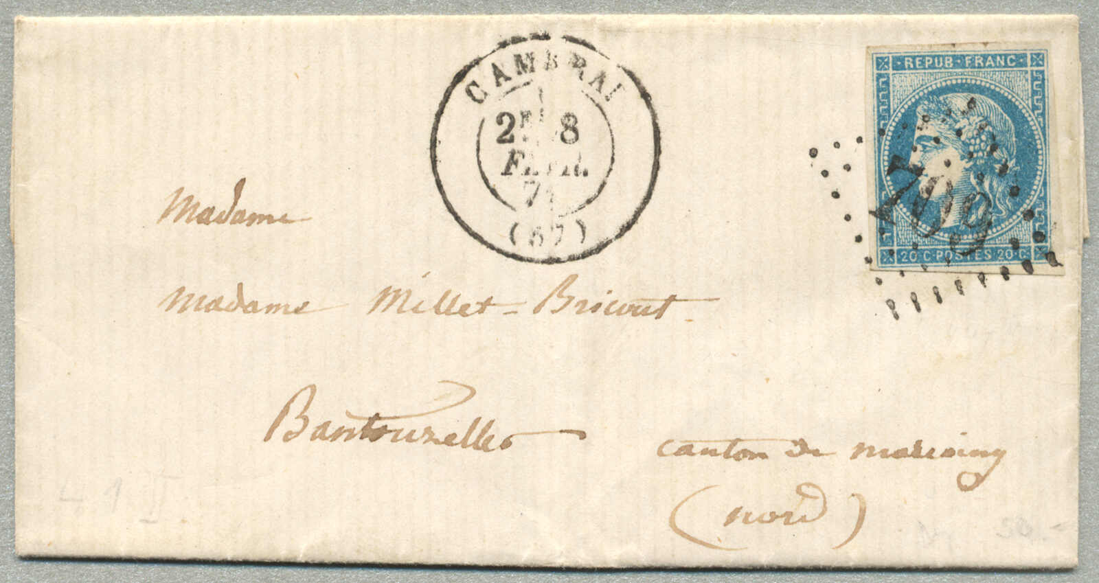 2263 on cover image1871, From Cambrai to Bantouzelle (canton de Marcoing, Nord), franked with 1x 20 c blue Ceres imperforate issue, cancelled with lozenge dot cancel with central numeral 709, circular date stamp CAMBRAI 28 AOUT 71 alongside, arrival backstamp MASNIERES 28 AOUT 71, clear to good margins, domestic single rate cover from early Third Republic, postmarks well struck, VF! Estimate 150€.