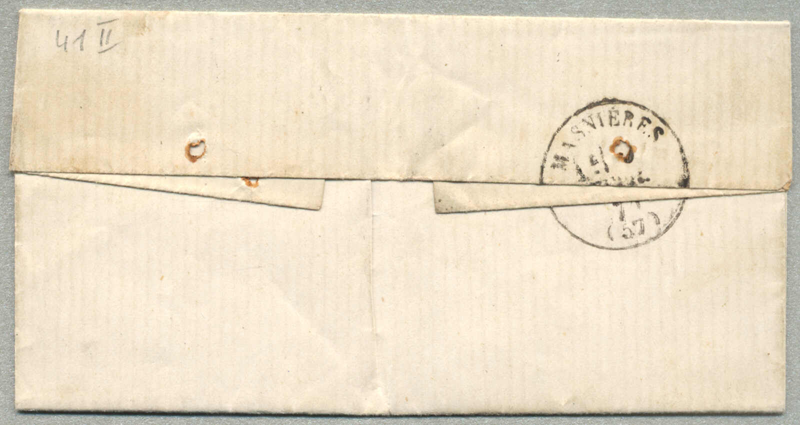 2261 on cover image1857, From Altkirch to Belfort, franked with 1x 20 c orange Napoleon imperforate issue, cancelled with lozenge dot cancel with central numeral 52, clear circular date stamp ALTKIRCH 28 AVRIL 57 alongside, blue double-ring sender cachet A. WINCKLER ALTKIRCH at lower right, arrival backstamp BELFORT 29 AVRIL 57, letter carried domestically within France, typical single rate letter from the classic Ceres-Napoleon period, lozenge 52 assigned to Altkirch adds postal history value, VF! Estimate 150€.
