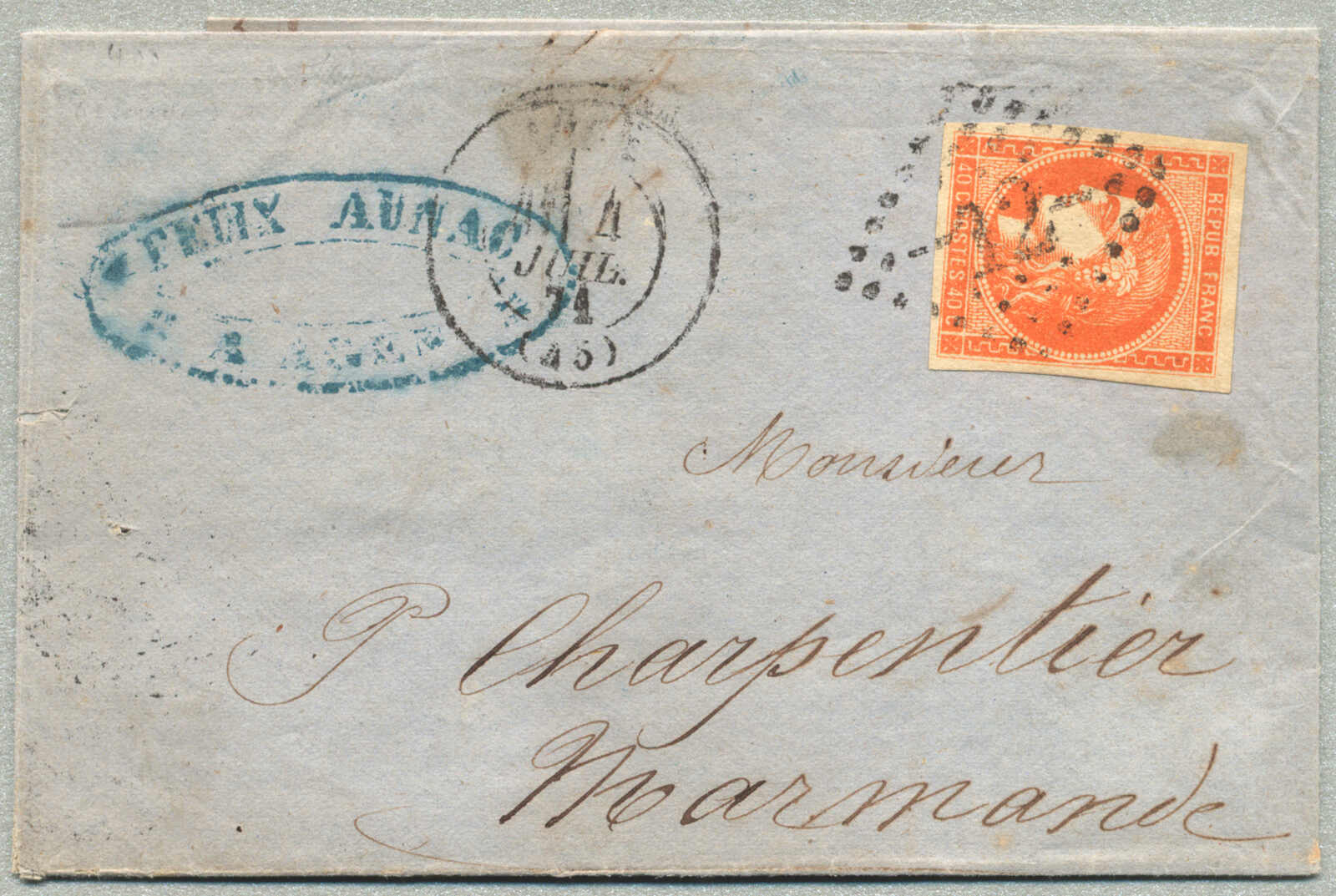 2268 on cover image1845, Agen to Marmande, folded letter franked with 40 centimes orange Cérès issue, tied by dotted lozenge cancel, circular date stamp AGEN 4 JUIL 45 alongside, arrival backstamp MARMANDE 5 JUIL 45, blue oval sender cachet FELIX AUNAC AGEN at upper left, clean commercial correspondence from early classic period of French philately, VF! Estimate 150€.