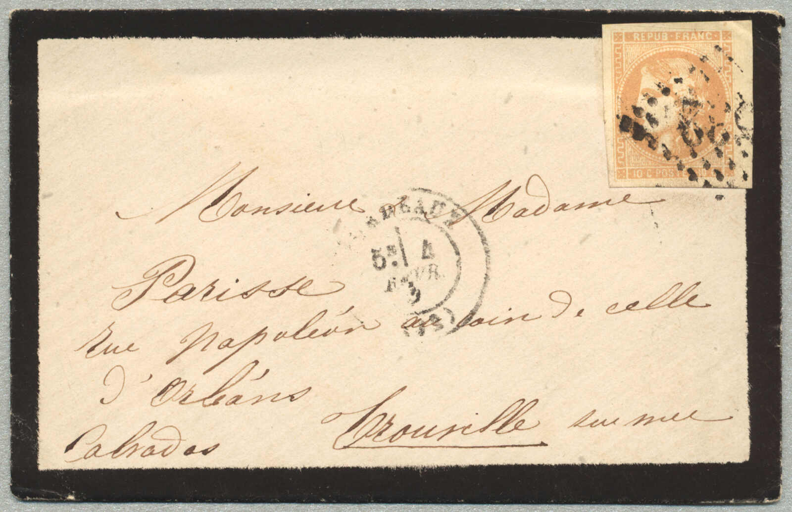 1871, ab Bordeaux zu Trouville sur Mer, Trauerumschlag freigemacht mit 1x 15 c ockerbraun Ceres ungezähnt Ausgabe, gestempelt mit Raute Punkt Stempel mit zentrisch Nummer 532, kreisförmig Datumsstempel BORDEAUX 21 AVRIL 71 daneben, Ankunftsstempel TROUVILLE 23 FEVR 71, klare zu gute Ränder, typische Anwendung von 15 c Taxierung während frühe dritte Republik, Franco-Prussian War Folge, Briefinhalts fehlend, Pracht! Schätzpreis 200 EUR.