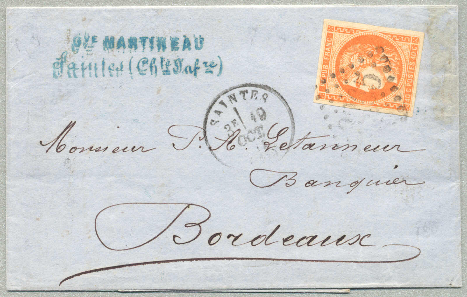 1871, Chteau-Salins nach Bordeaux, Faltbrief freigemacht mit 40 centimes orange Cerès Ausgabe, übergehend entwertet durch punktierten Rautenstempel, kreisförmig Datumsstempel CHATEAU SALINS 19 OCT 71 daneben, Ankunftsstempel BORDEAUX 20 OCT 71, blauer ovaler Absenderstempel VVE MARTINEAU FAILLISEL CHATEAU-SALINS oben links, handelsüblich Korrespondenz adressiert nach ein Bankier, sauber und gute Abschläge Spätentwertung von Klassikers Cerès Ausgabe in Nachkriegs Frankreich, Pracht! Schätzpreis 150 EUR.