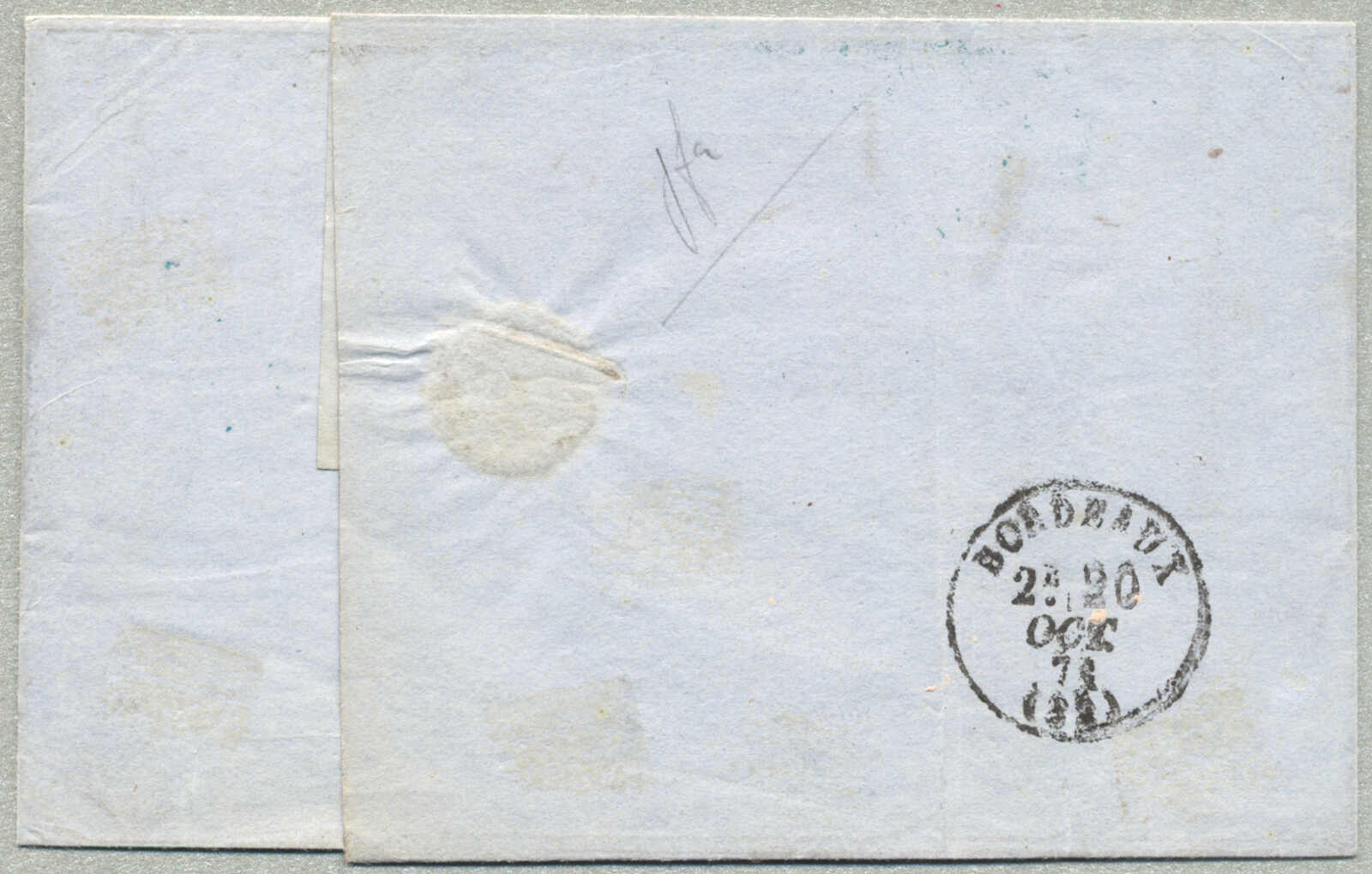 1865, ab Bordeaux nach Paris, Faltbriefbogen freigemacht mit Dreifarben Mischfrankatur von Ceres ungezähnt Ausgaben: 1x 5 c grün, 1x 30 c braun, und 1x 40 c orange, alle gestempelt mit Zweikreis BORDEAUX Datumstempeln, zusätzlicher Abschlag daneben datiert BORDEAUX 28 FEVR 71, blau Absenderstempel A. LAFARGUE und CIE BORDEAUX unten links, schwach Ankunftsstempel PARIS gegenwärtig, ringsum voll- bis breitrandig, handelsüblich Korrespondenz während frühe dritte Republik kurz danach enden des Belagerung von Paris, volles 75 c Taxierung Frankatur, ungewöhnliche Verwendung von kreisförmig Datumsstempel für Entwertung statt Nummernstempel, Kabinett! Schätzpreis 180 EUR.