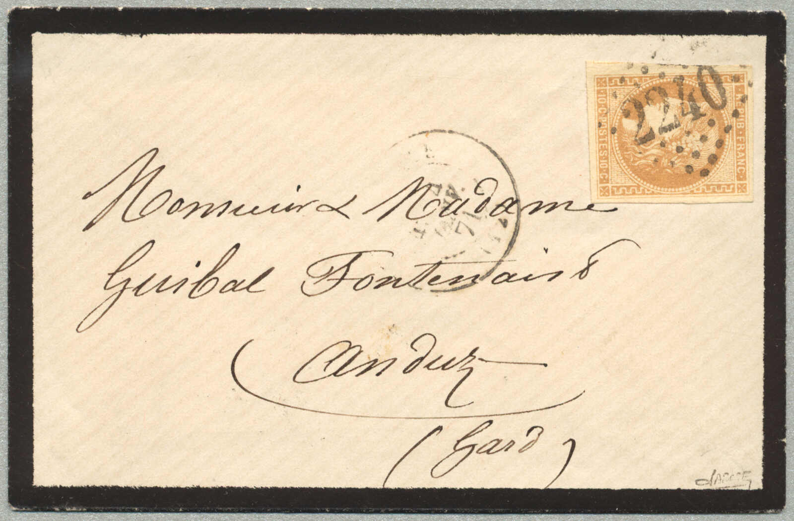 2265 on cover image1871, from Marseille to Anduze, mourning envelope franked with 1x 15 c bistre Ceres imperforate issue, cancelled with lozenge dot cancel with central numeral 2240 (assigned to Marseille), partial circular date stamp MARSEILLE faint but legible, arrival backstamp ANDUZE 22? MAI 71, letter content missing, clear to good margins, typical domestic mourning usage during the early Third Republic, post-Franco-Prussian War period, VF! Estimate 200€.