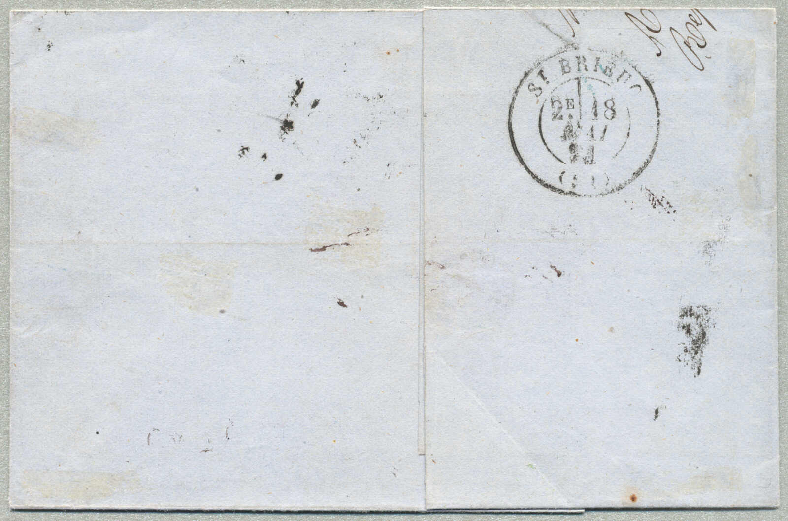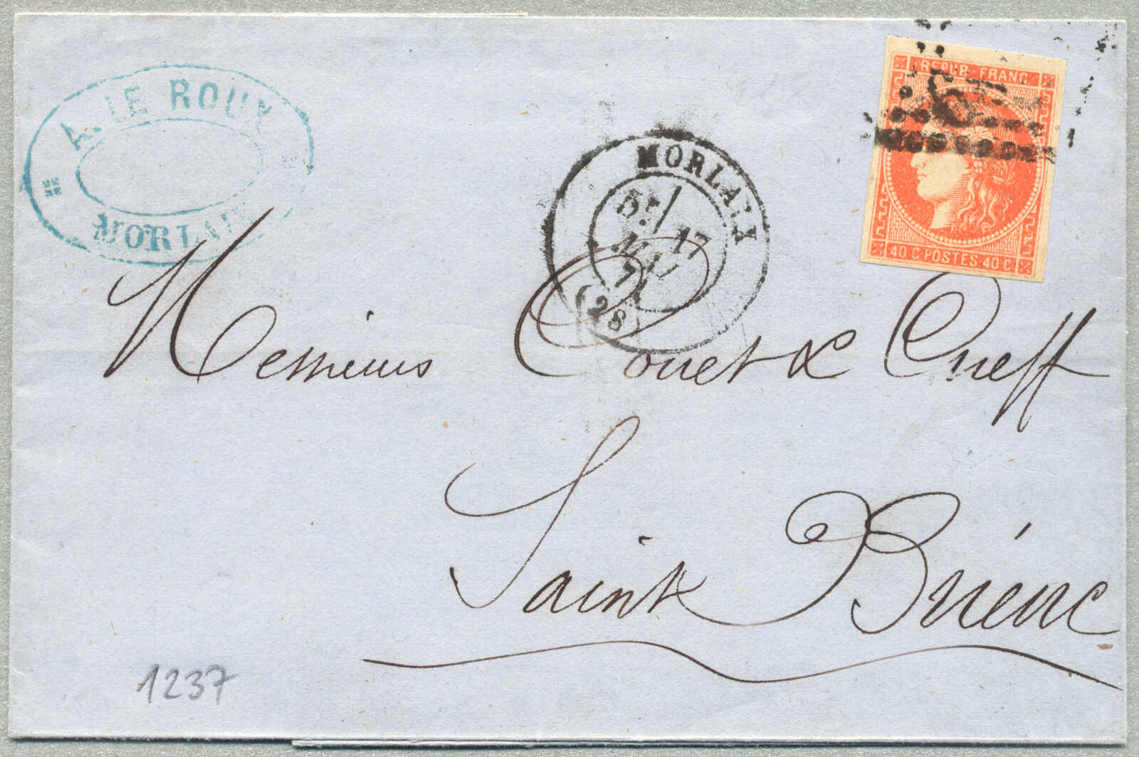 2267 on cover image1851, Morlaix to Saint-Brieuc, folded letter franked with 40 centimes orange Cérès issue, tied by lozenge of dots cancel, circular date stamp MORLAIX 27 AVRIL 51 alongside, arrival backstamp ST BRIEUC 28 AVRIL 51, commercial correspondence with oval sender cachet A LE ROUX MORLAIX in blue at upper left, neat early classic period usage in the 40c domestic letter rate, VF! Estimate 150€.