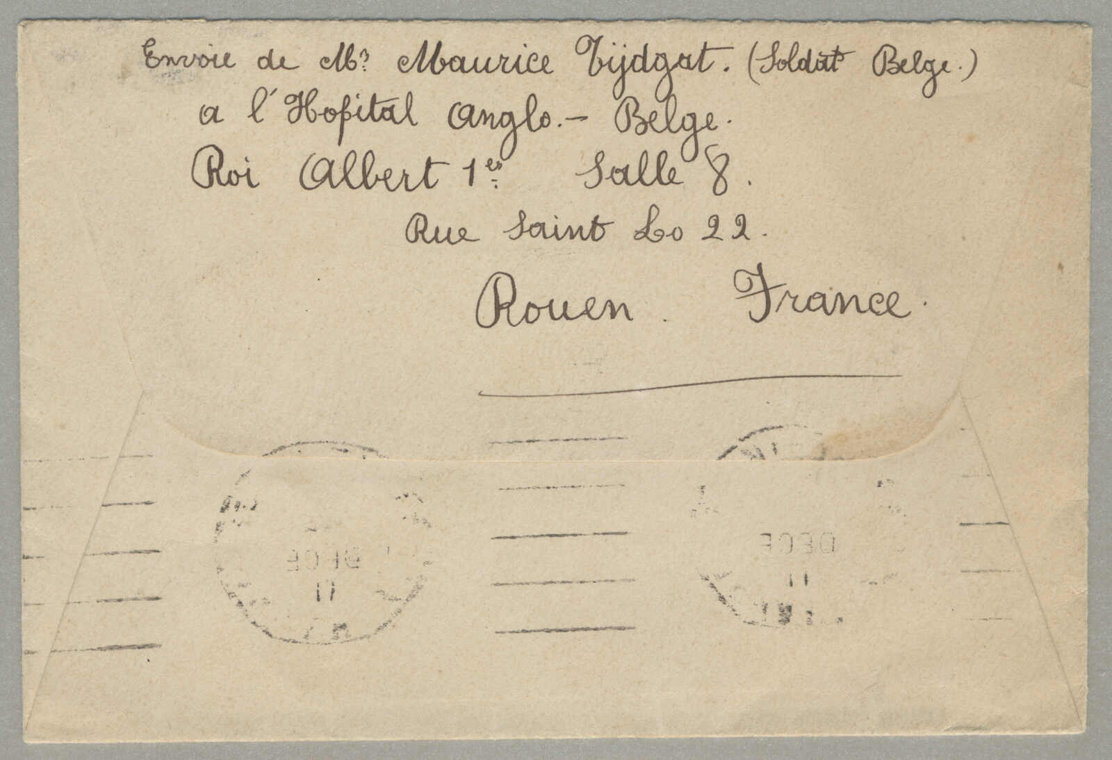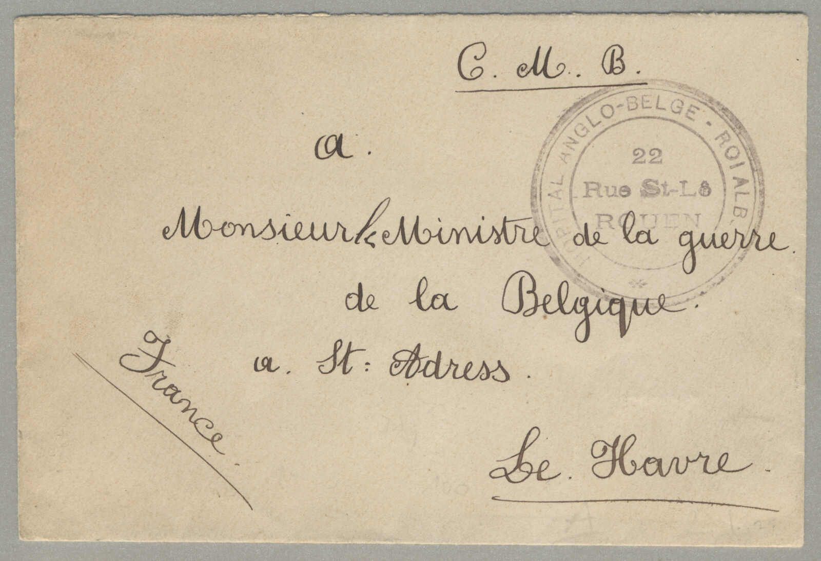 2275 on cover image1917, From Rouen to Le Havre, stampless envelope sent by Belgian military personnel, addressed to the Belgian Minister of War at St. Adresse (Le Havre), France, bearing large violet cachet HOPITAL ANGLO-BELGE ROI ALB., arrival 11. DECE 17, used as sender marking in place of postage, military handback or courier mail under Belgian-French hospital agreement, with manuscript underlined C. M. B., historical item linked to Belgian exile government infrastructure in northern France during WWI, rare internal hospital-origin soldier correspondence, military post emanating from the Hôpital Anglo-Belge Roi Albert established in Rouen, operating under joint Anglo-Belgian authority as part of the Allied medical network, primarily treating wounded Belgian soldiers repatriated to France, cachet HOPITAL ANGLO-BELGE ROI ALB. used in lieu of franked postage according to wartime military-postal conventions, addressed to Saint-Adresse, the temporary seat of the Belgian government-in-exile from October 1914 until the end of World War I, where prominent political figures such as Prime Minister Charles de Broqueville and War Minister Armand De Ceuninck coordinated military affairs in close cooperation with the French and British governments, manuscript C. M. B., likely denoting Corps Médical Belge or a named officer of similar rank, indicative of intra-hospital correspondence or official dispatch to central wartime command structures, a poignant artifact reflecting Belgian sovereignty in exile, diplomatic resilience, and Franco-Belgian military cooperation, representing the unique postal byproduct of geopolitical displacement and field medical operations during the First World War, ex Kugel, XF! Estimate 800€.