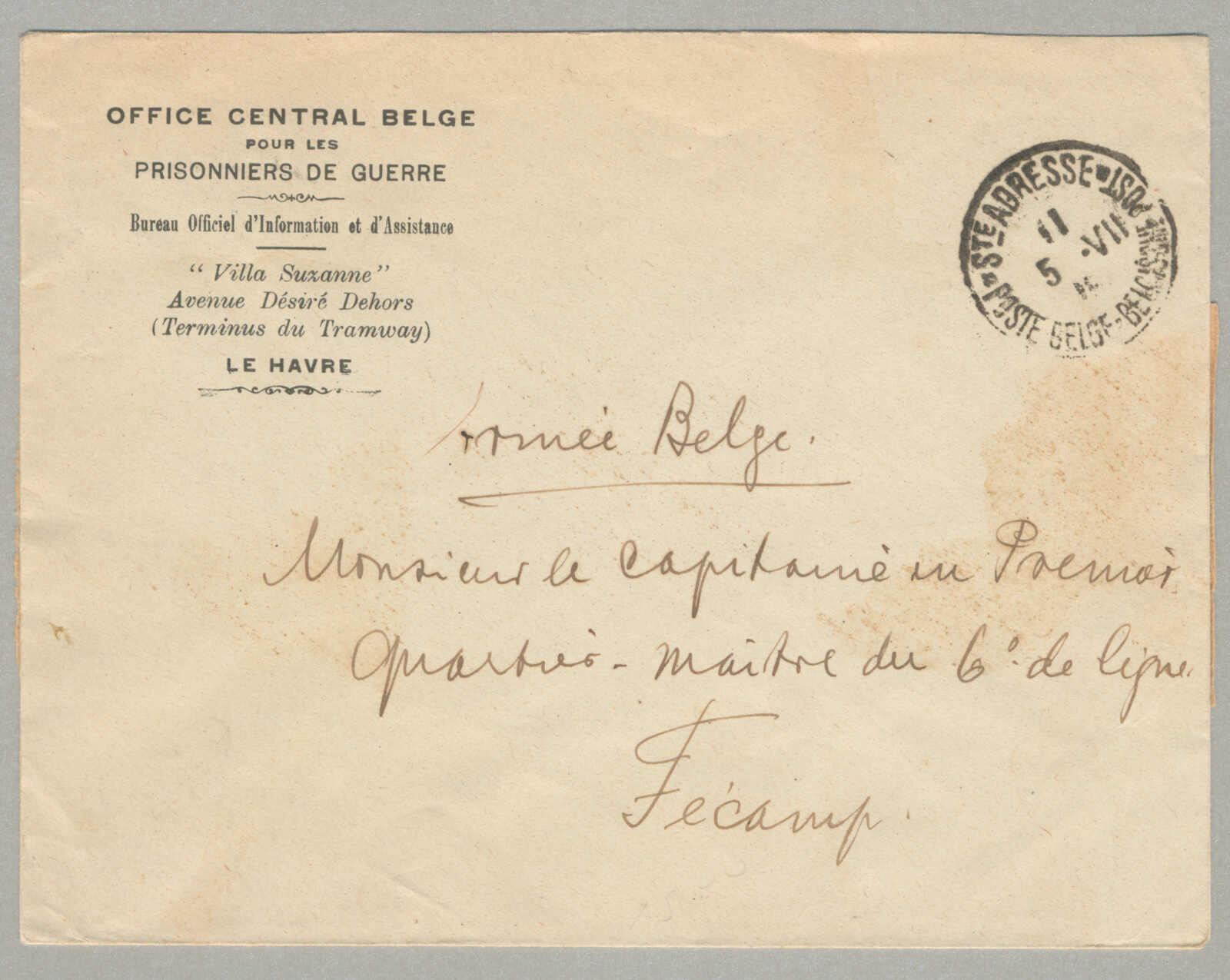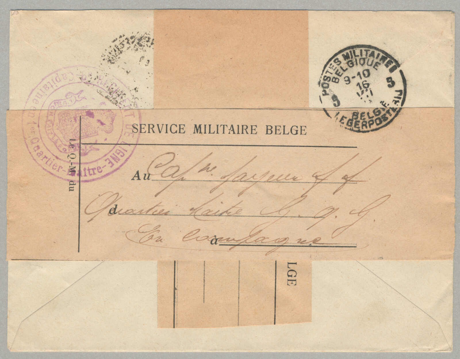 2277 on cover image1916, from Le Havre to Fécamp, envelope from the Office Central Belge pour les Prisonniers de Guerre (Villa Suzanne, Le Havre), addressed to the Belgian Army Chaplain Opanker, maître du 6e de ligne, Service Militaire Belge, franked by official franchise with circular datestamp LE HAVRE STE ADRESSE POSTES 5.XI.16, reverse with sealing labels and two black circular postmarks POSTES MILITAIRES BELGES 9.XI.16 GERARDOFF and BELGIAN MILITARY CENSORSHIP, large violet military handstamp of 1er Quartier-Maître de l’Armée Belge, folded and resealed with official tape, rare example of official Belgian military communication from the French exile base, reflecting wartime coordination and prisoner affairs during German occupation of Belgium, ex Kugel, XF! Schätzpreis 500€. (Image) (imagea) (All Images)