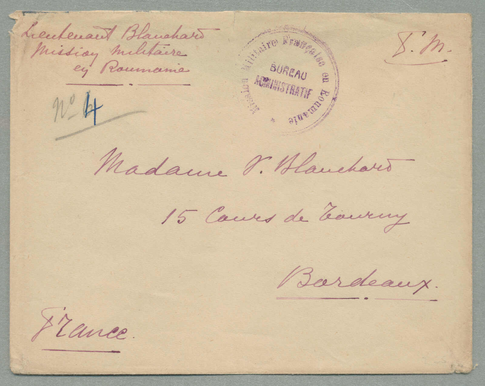 2301 on cover imageabout 1917, from the French Military Mission in Romania to Bordeaux France, stampless envelope from Lieutenant Blanchard, endorsed Mission Militaire en Roumanie at top right, addressed to Madame V. Blanchard at 15 Cours de Tourny Bordeaux, bearing full strike of violet cachet BUREAU ADMINISTRATIF MISSION MILITAIRE FRANCAISE EN ROUMANIE, no markings on reverse, carried under military mail privilege without franking, wartime correspondence from French officers embedded with Romanian forces during World War I following Romania’s entry into the war on the Allied side, rare usage from a historically significant liaison mission, ex Kugel, VF! Estimate 400€.