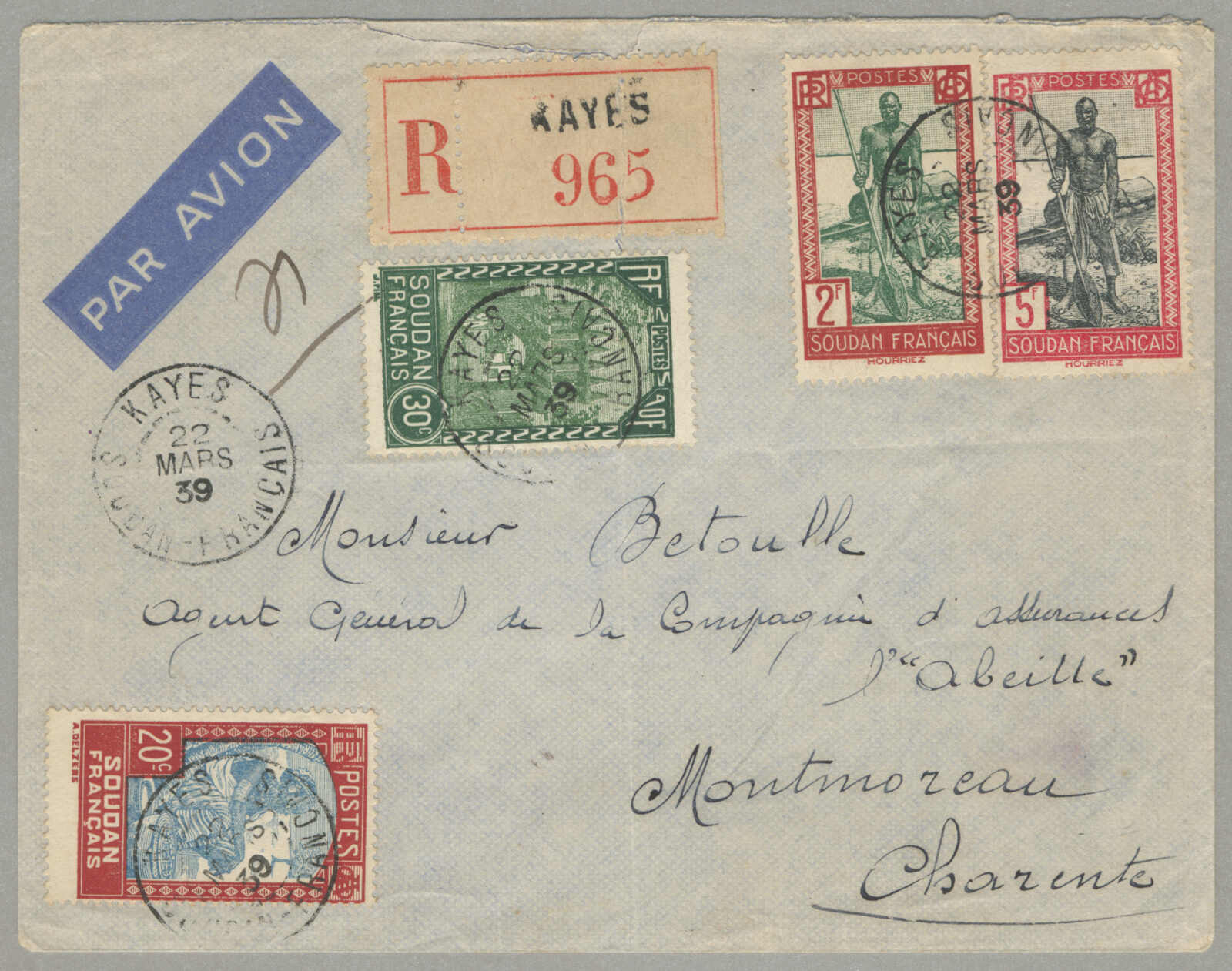 2354 on cover image1939, from Kayes to Montmoreau Charente, registered airmail letter franked with four different French Soudan issues including 2f green and red, 5f black and red, 20c blue and red, 30c green and 20c red and blue, cancelled KAYES 22 MARS 39 SOUDAN FRANCAIS, blue PAR AVION upper left, red registration label KAYES 965, addressed to Monsieur Betoulle, agent of the Compagnie d Assurances l Abeille, Montmoreau (commune in the Charente departement of southwestern France, now part of Montmoreau-Saint-Cybard), clear commercial origin from West Africa during late colonial period, ex Kugel, VF! Estimate 400€.