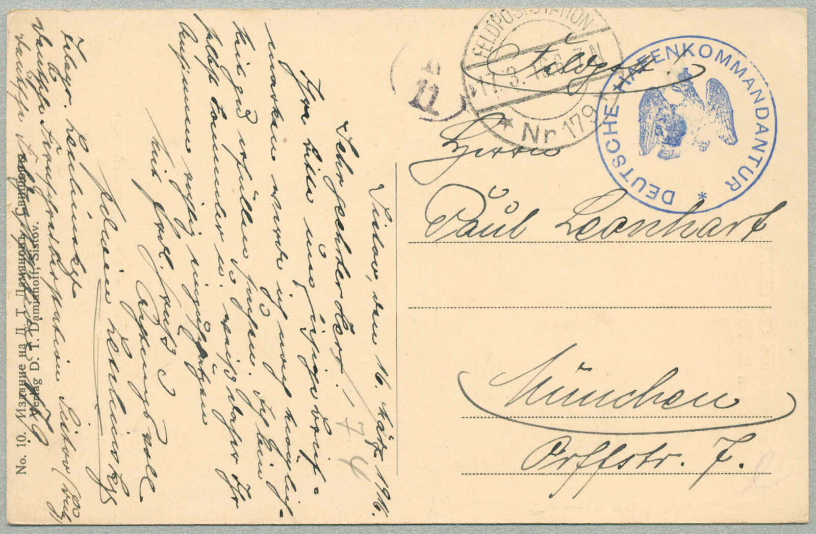 2386 on cover image1916, from SISTOV to MUNICH, German Feldpost usage during World War I, picture postcard depicting main street and post office in Sistov, cancelled with violet circular DEUTSCHE HAFENKOMMANDATUR circular cachet at upper right and FELDPOSTSTATION Nr 179 cancel dated 17.3.16 6-7N, from the German Port Command office in the Danube port of Sistov during WWI, highly unusual marking, excellent strike and well-preserved card with photographic view of Alexander-Hauptstrasse and telegraph station, rare usage from German military occupation in Bulgaria, historical context relates to the Central Powers' Danube operations following Bulgaria’s alliance with Germany and Austria-Hungary in October 1915, this card likely mailed during the coordinated efforts of the Central Powers to secure the Balkans front and maintain supply lines along the Danube, the sender was stationed in one of the most strategically vital towns on the lower Danube, the Hafenkommandantur in Sistov oversaw logistics for riverine military transport and supply crucial to operations on the Salonika front, Sistov (modern Svishtov) held importance as the closest Bulgarian town to Romanian territory across the Danube, the card predates Romania’s entry into the war (August 1916) and may have been posted during General August von Mackensen's Balkan campaign coordination period, DEUTSCHE HAFENKOMMANDATUR marking in violet is of exceptional rarity especially in this clarity and completeness, such material is seldom encountered from the Danube-based German military command posts, the view of Alexander-Hauptstrasse underlines the infrastructural development maintained under German-Bulgarian administration, linked historically to military telegraphy and communication logistics essential for the Central Powers, XF! Estimate 1.200€.