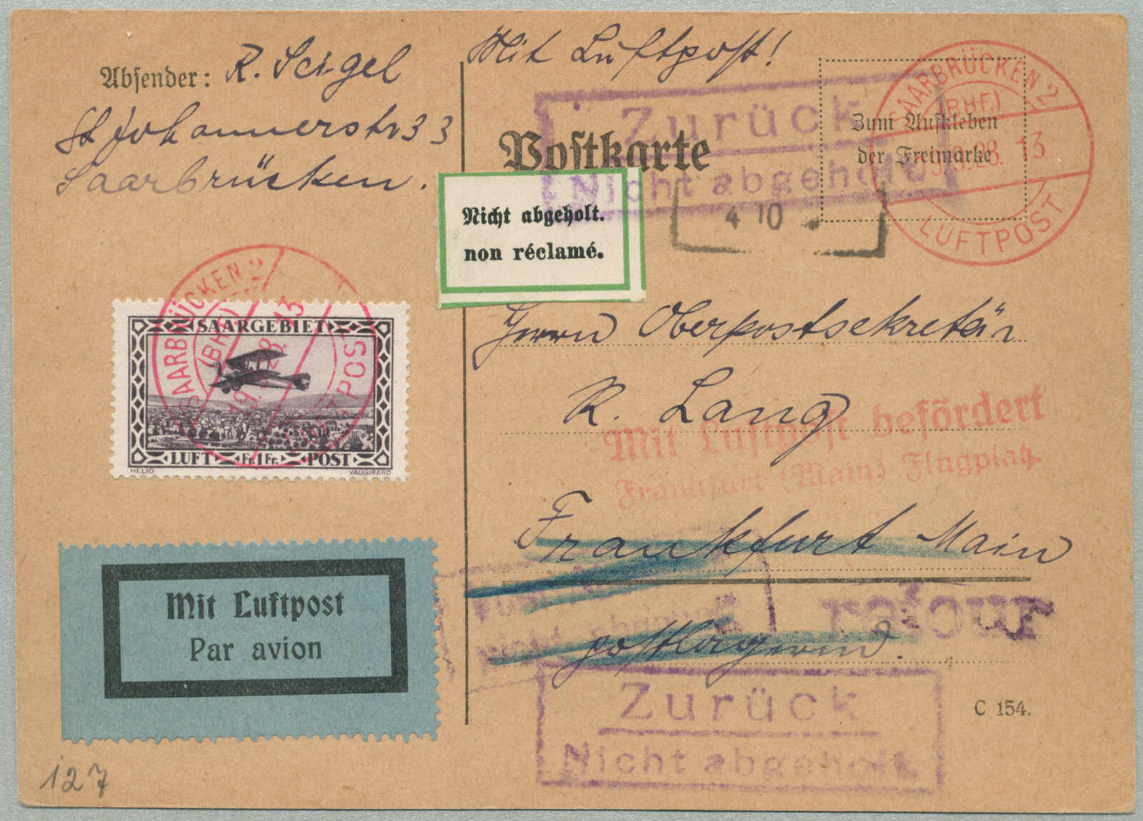 2408 on cover image1928, from Saarbrücken to Frankfurt am Main, franked with 1 franc Saar stamp, tied by SAARBRÜCKEN 2 BHF LUFTPOST 19 9 28 13 red circular datestamp, blue airmail etiquette label Mit Luftpost / Par avion, used red handstamp Mit Luftpost befördert Frankfurt (MAIN) FLUGPLAZ, returned undelivered with purple boxed handstamp ZURÜCK NICHT ABGEHOLT and green bilingual etiquette Nicht abgeholt / non réclamée, various crossed-out delivery attempt, rare returned domestic airmail during League of Nations administration of Saargebiet, illustrating the transitional postal history under the Völkerbundsmandat following the Treaty of Versailles, Saargebiet administrated by the League of Nations from 1920 to 1935, overseen by a Governing Commission appointed by the League including figures such as Victor Rault of France and Sir Ernest Colville Collins Wilton of Britain, the cover documents the regulated yet increasingly strained communication between occupied zones and German territories in the interwar period, with Saarbrücken's Luftpost infrastructure reflecting international oversight, postal markings underscore logistical challenges and limited claim periods for internal airmail during this mandate era, ex Kugel, XF! Schätzpreis 600€. (Image) (imagea) (All Images)