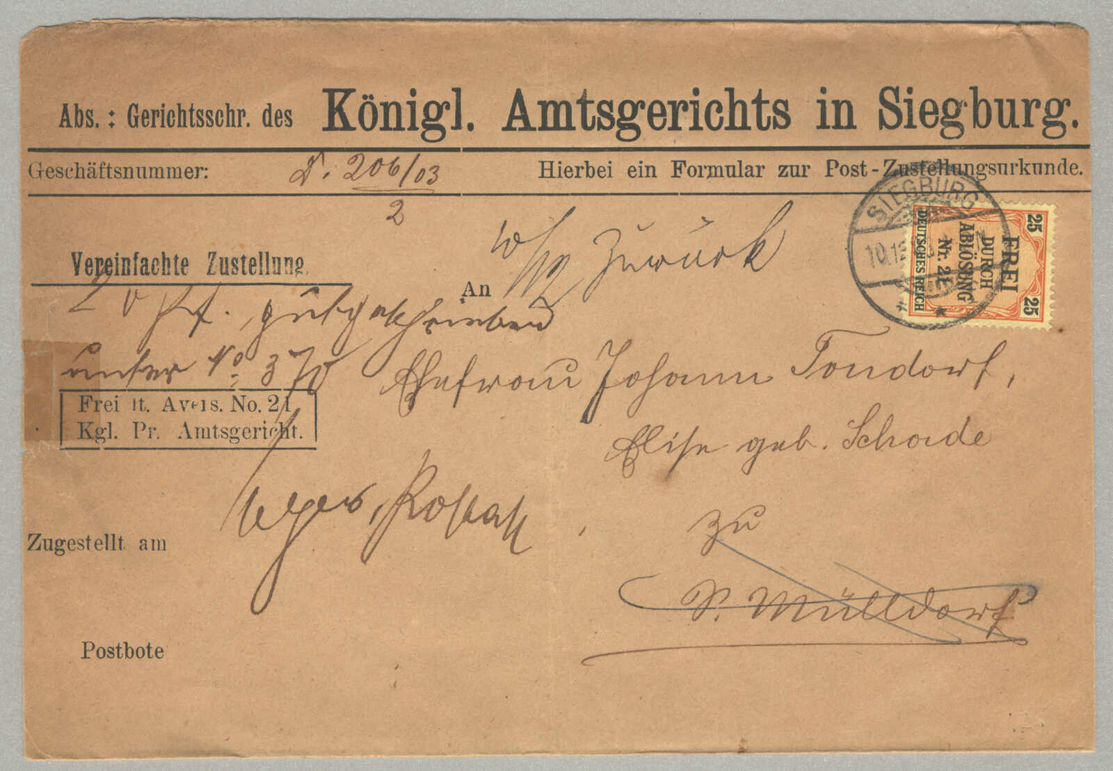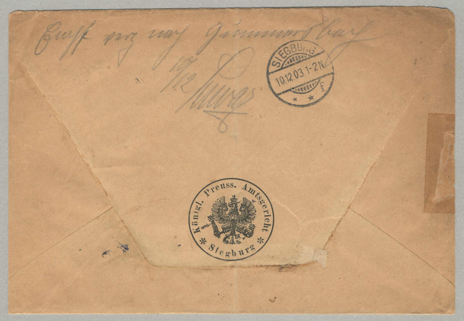 2402 on cover image1903, from SIEGBURG local judicial dispatch, official envelope from the Royal Prussian District Court (Königl. Amtsgericht in Siegburg), franked with 25 pf orange and black DEUTSCHES REICH issue with black overprint FREI DURCH ABLOSUNG Nr 21, tied by SIEGBURG 10 12 03, boxed official cachet FREI lt. Avis No 21 Kgl. Pr. Amtsgericht, black eagle court seal of the Königl. Preuss. Amtsgericht on reverse, delivery instruction markings and handwritten notations front and back, full backstamp SIEGBURG 10 12 03 1-2N, part of Prussian legal correspondence system exempt from regular postal rates through government accounting system, ex Kugel, XF! Schätzpreis 200€. (Image) (imagea) (All Images)