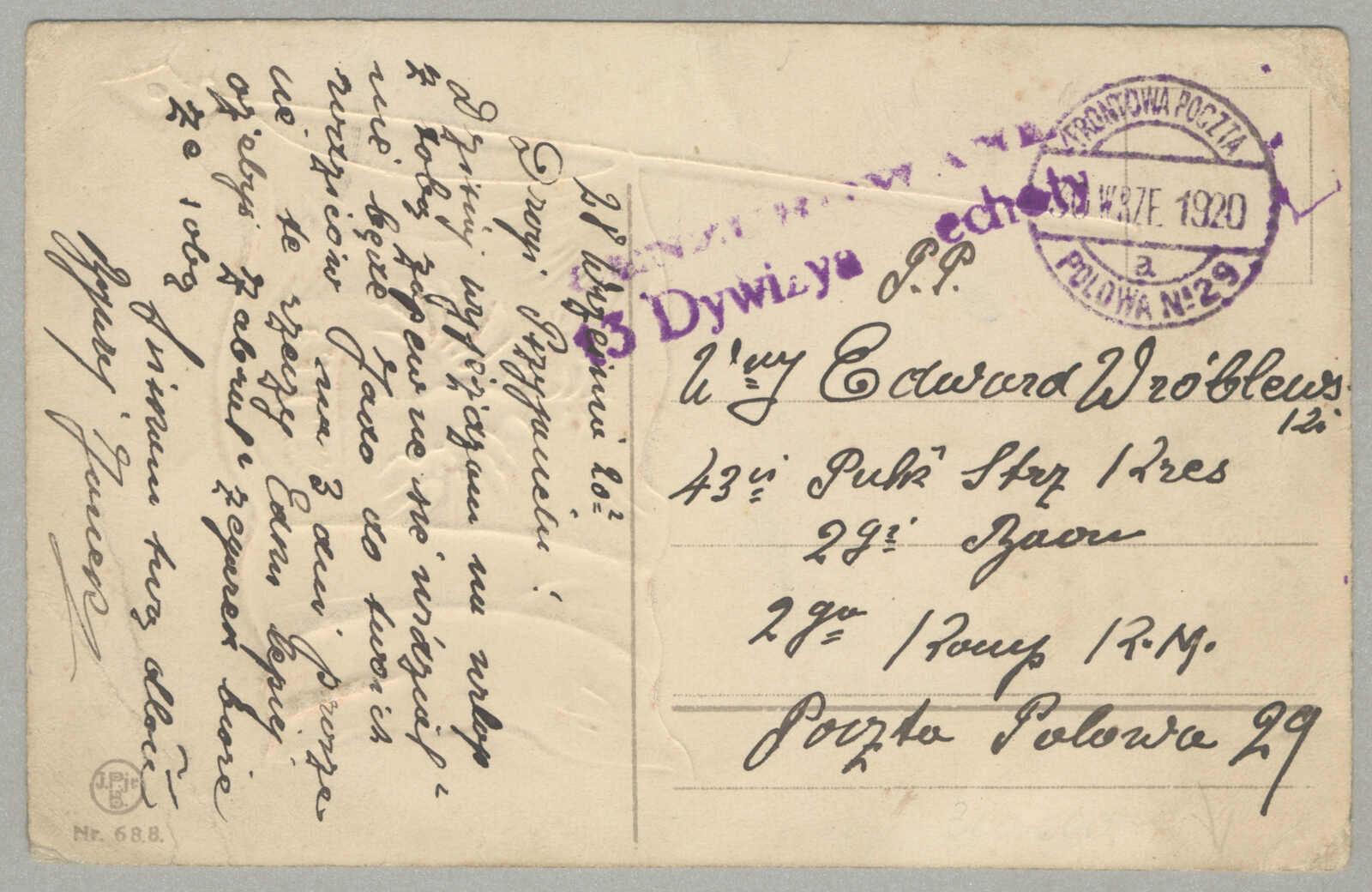 2479 on cover image1920, patriotic picture postcard showing crowned white eagle on red flag, evocative of the Polish national symbol revived after over a century of partitions by Russia, Prussia, and Austria, stampless military use addressed to a soldier of the 43rd Infantry Regiment, 12th Infantry Division, historically linked to the defense of eastern borders during the POLISH–SOVIET WAR, with manuscript routing to Poczta Polowa 29, a mobile field post office supporting active operations in the volatile Kresy region, tied by circular military datestamp dated 30 WSZE 1920, this rare Polish-language abbreviation of WRZESIEŃ (September) reflects period-specific usage and calendar practices of the Polish Army, handstamped violet 13 Dywizja Piechoty and CENSUROWANO censor marking, indicating internal transfer within major field formations and passage through censorship in compliance with wartime security protocols, light edge wear and creases consistent with frontline handling, otherwise fine, rare and appealing example of Polish fieldpost with censorship during the Polish–Soviet conflict, issued at the height of hostilities surrounding the Battle of the Niemen River, ex Kugel, XF! Estimate 400€.