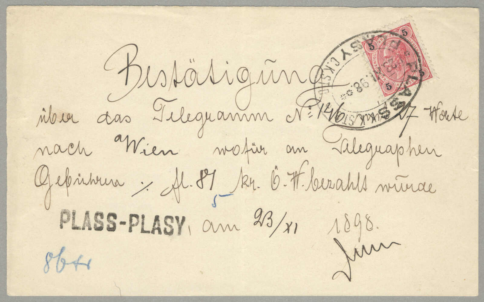1898, telegram fee receipt with handwritten confirmation of dispatch for telegram No. 146, franked with 5 kr rose red issue of 1890 to pay the receipt fee, bilingual railway cancel PLASS-PLASY C.K.STO. 23 XI 98 and railway formular