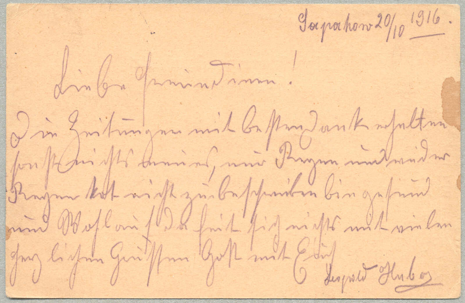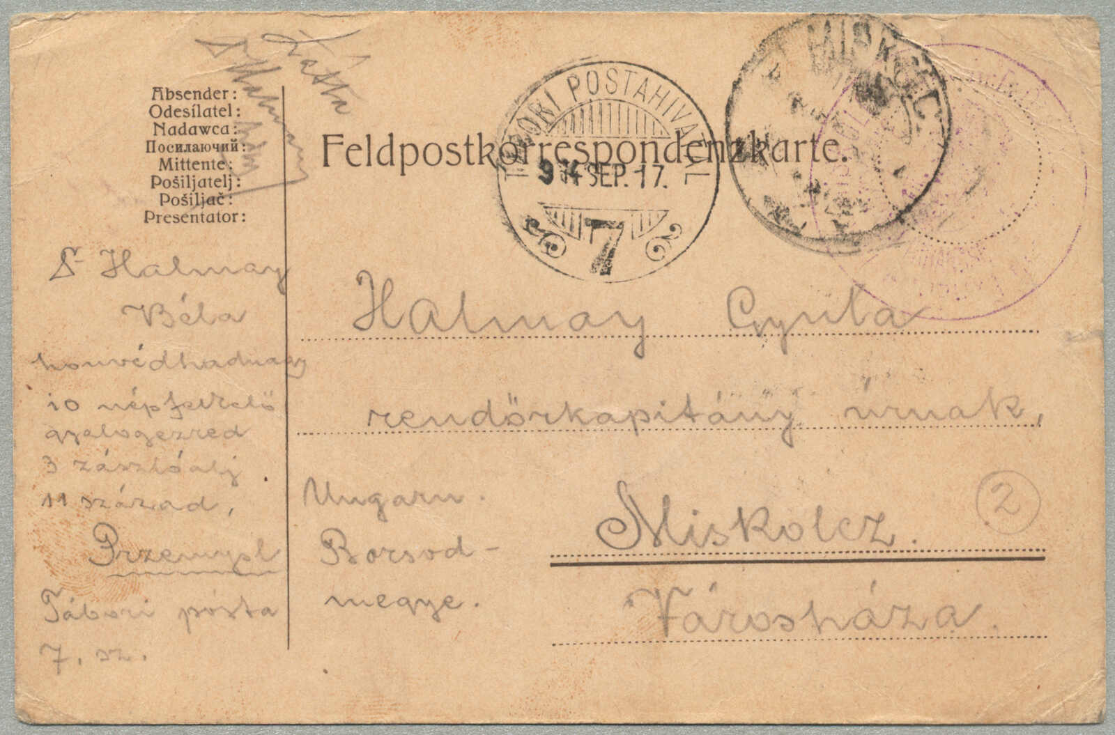 1914, feldpost card, sent from Przemysl to Miskolc, postmarked TABORI POSTAHIVATAL 7 / 14 SEP 14, one of the last mail items to leave before the Russian siege of Przemysl began on September 18, 1914, rare historical wartime usage, fresh
