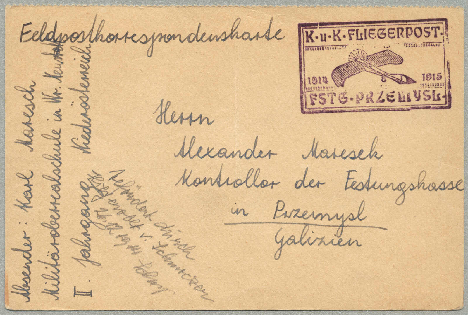 1915, airmail Feldpost card, sent to the besieged city of Przemysl, endorsed K.U.K. FLIEGERPOST FSTG. PRZEMYSL, Brzesko cachet, said to have been sold in Vienna, pencil notation suggests transport on 24 December 1914 by Lt. Schmocser