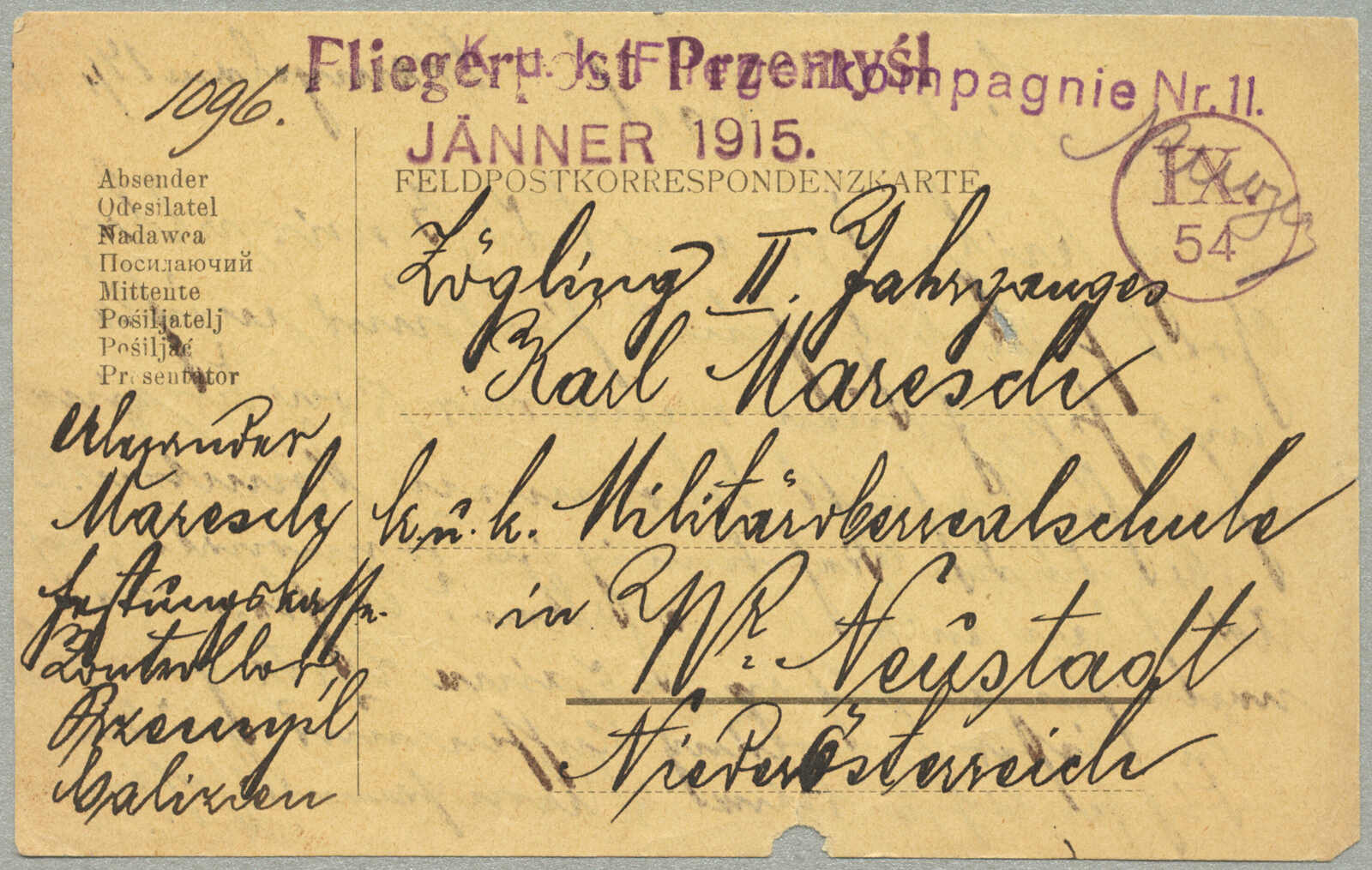1915, Airmail Feldpost card, sent from the besieged city of Przemysl, endorsed FLIEGERPOST PRZEMYSL / JÄNNER 1915, postmarked IX/54 20MM CIRCULAR HS, additional handstamp FLIEGERKOMPAGNIE NR. 11, dated 14 January 1915, carried on the