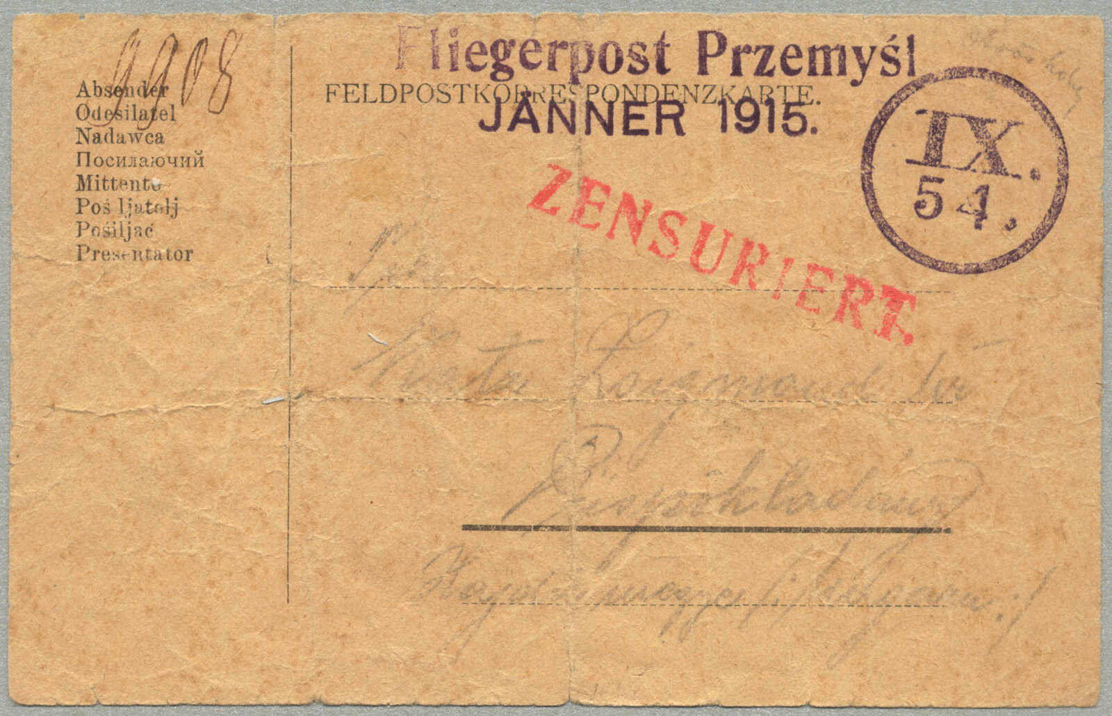 1915, Airmail Feldpost card, sent from the besieged city of Przemysl, endorsed FLIEGERPOST PRZEMYSL / JÄNNER 1915, postmarked IX/54 26MM, red ZENSURIERT cachet, manuscript 9908, dated 7 January 1915, carried on the outbound flight of 18