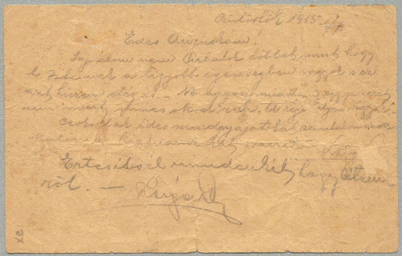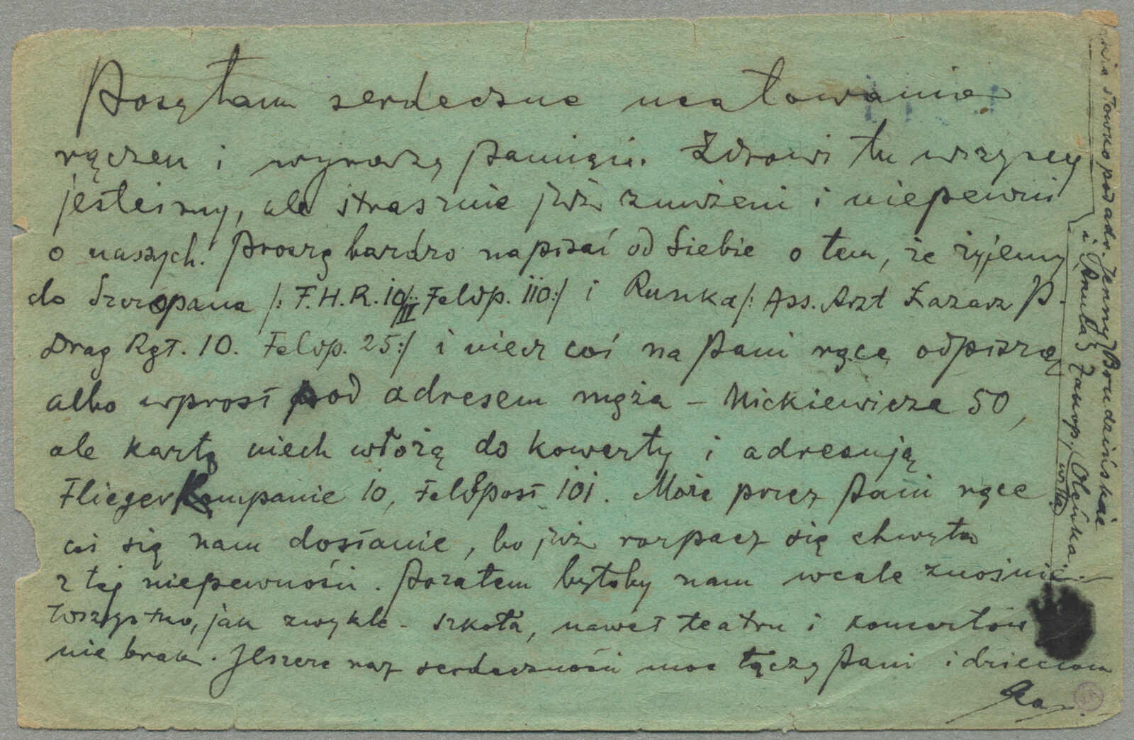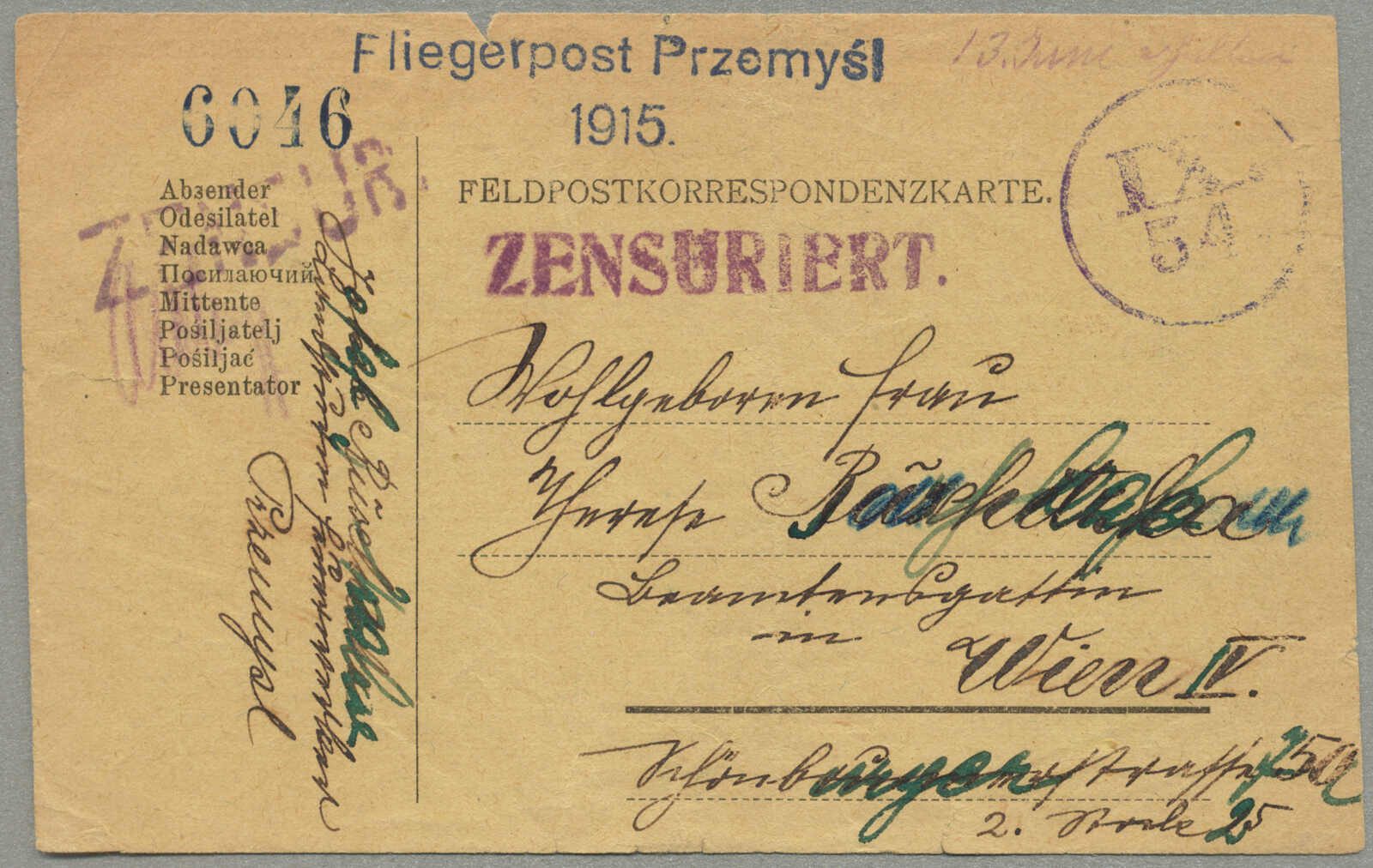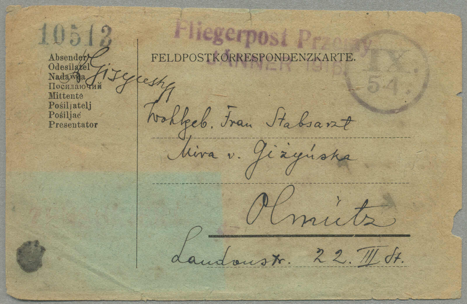 1915, Airmail Feldpost card, sent from the besieged city of Przemysl, undated green card, likely from the March 22 outbound flight, endorsed FLIEGERPOST PRZEMYSL, postmarked IX/54 26MM CIRCULAR HS, numbered HS 10512, historical wartime