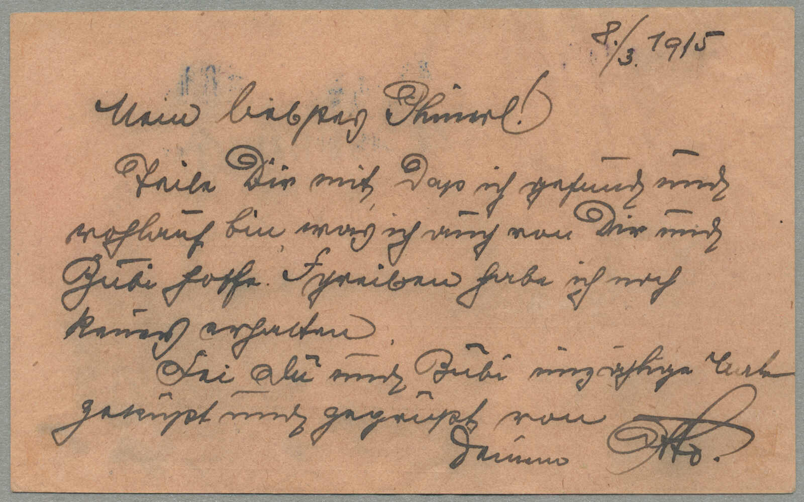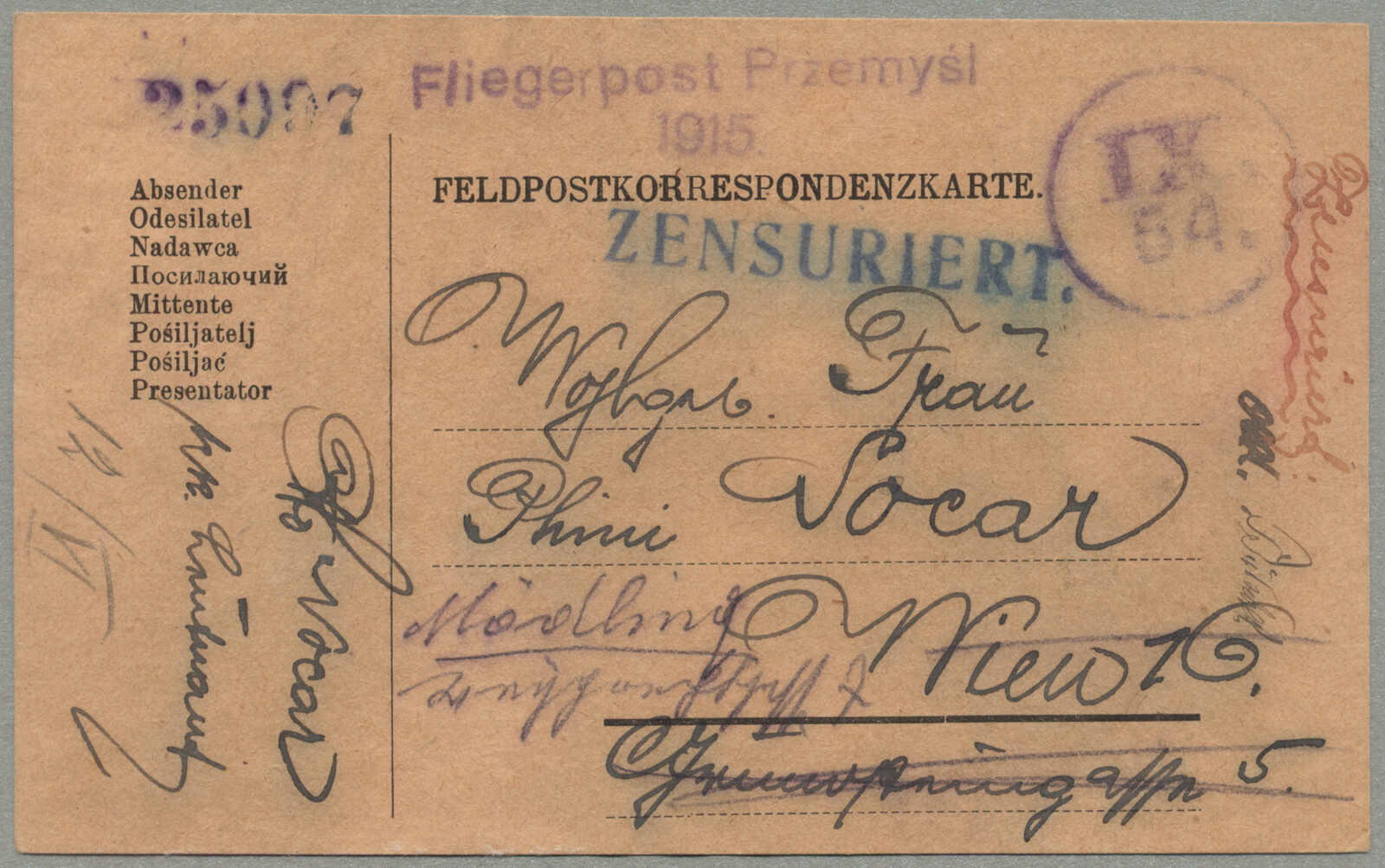 1915, Airmail Feldpost rose colored card, sent from the besieged city of Przemysl, dated 8 March 1915, endorsed FLIEGERPOST PRZEMYSL / 1915, postmarked IX/54 TYPE 2 HS, numbered HS 25997, red pen ZENSURIERT, blue ZENSURIERT, carried on