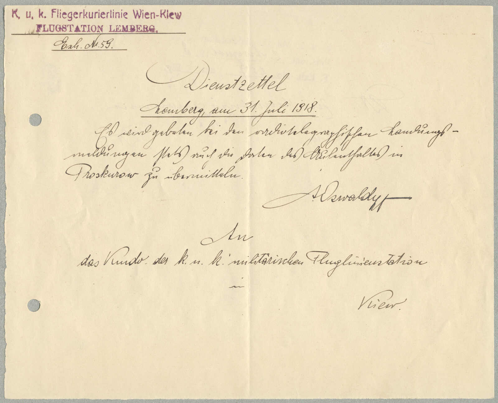 1918, Airmail cover, from Lemberg to Kiev, endorsed by violet handstamp FLUGSTATION LEMBERG, official service note sent via the Vienna to Kiev Air Courier Service, postmarked 31 July 1918, backstamped and dated Kiev, 31 August 1918, rare