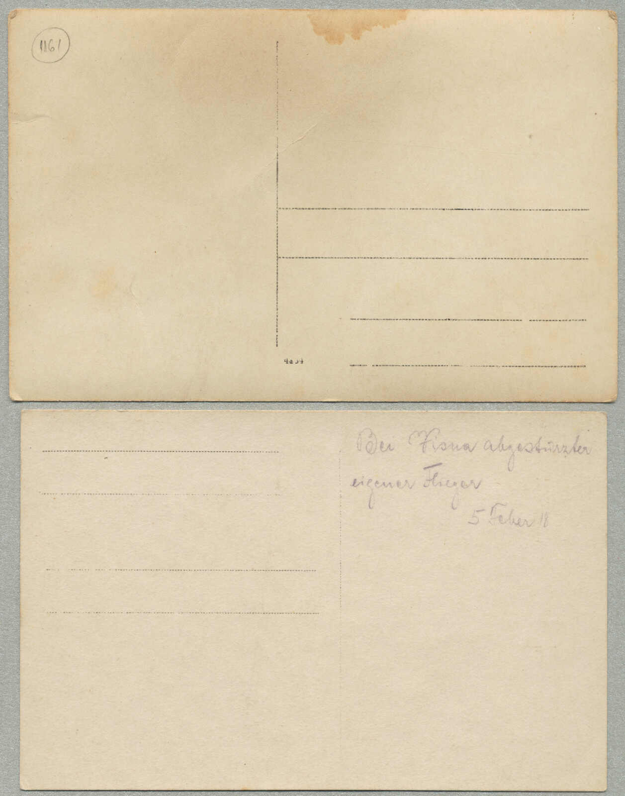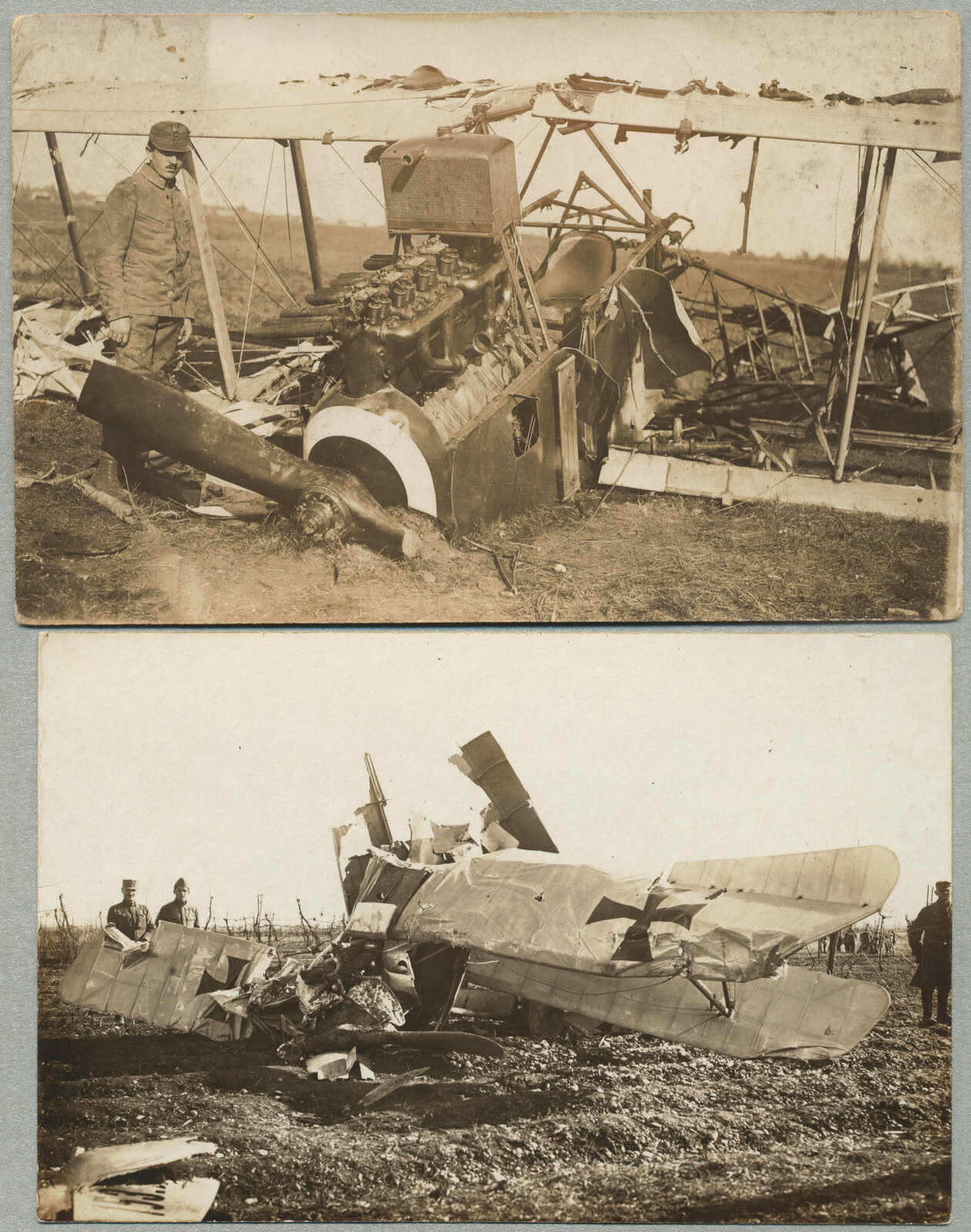 1918, 2 Airmail postcards, depicting an Austrian aircraft crash on February 5, 1918, handwritten annotation on reverse indicating Der Flieger abgestürzt eigener Tage 5 Febr 18, clear photographic detail of wreckage with uniformed