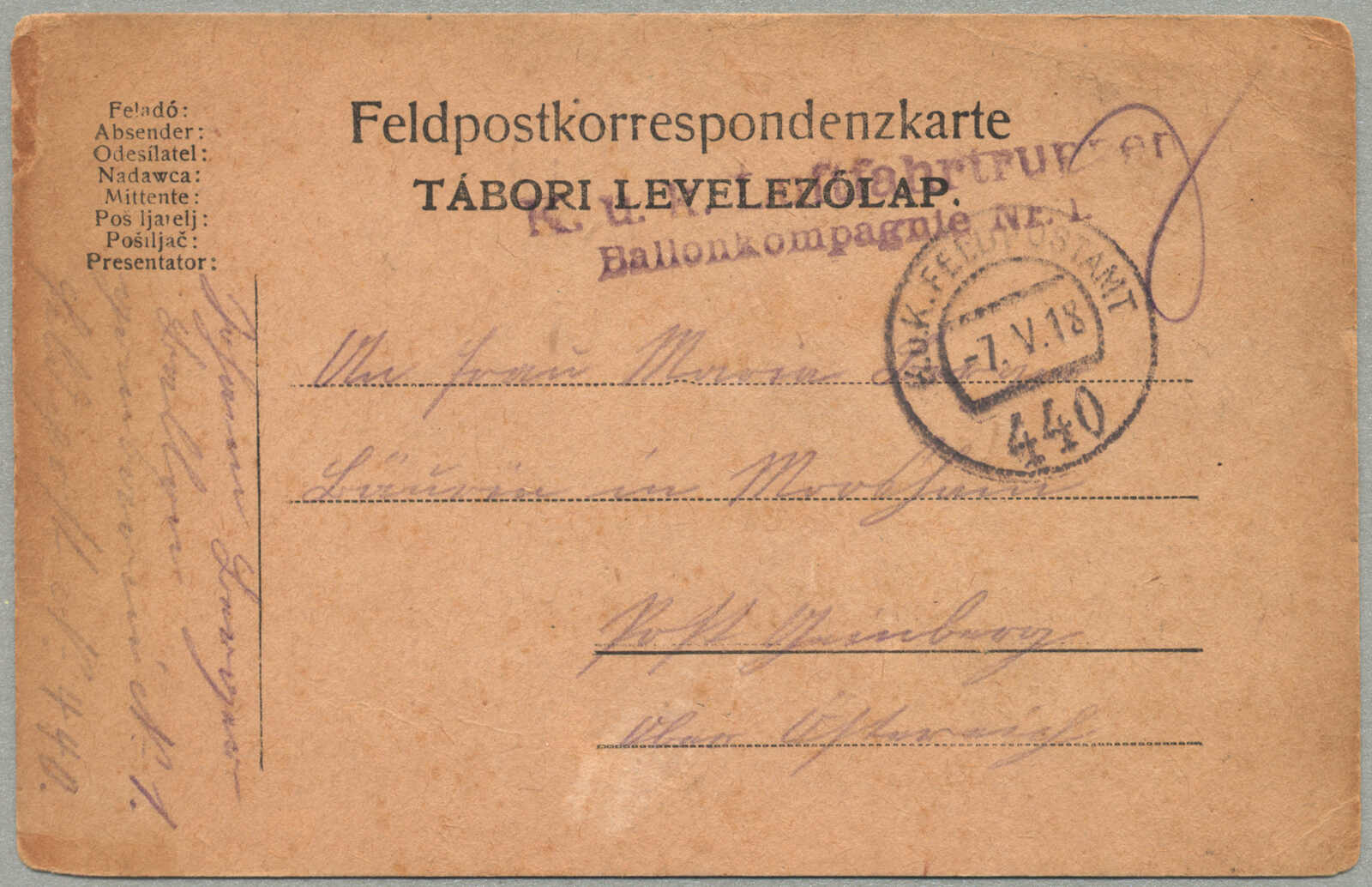 1918, Field post card, sent from the Austro-Hungarian K.u.K. Luftfahrtruppen, Ballonabteilung Nr. 1, postmarked FELDPOSTAMT 440 7.V.18, addressed to Hamburg, Germany, handwritten military correspondence, historical usage during World War