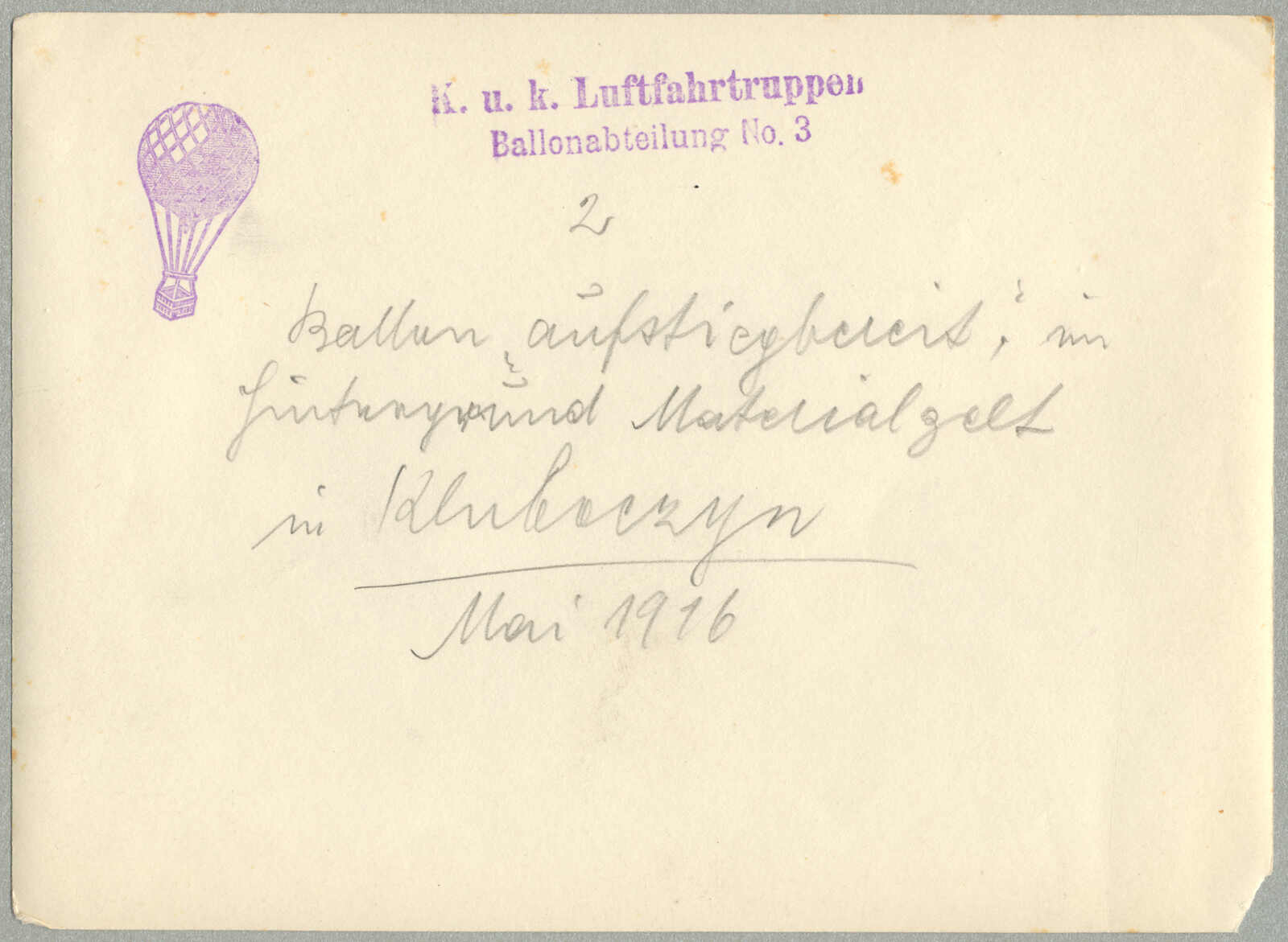1916, Airmail cover, from Austria-Hungary, endorsed by violet handstamp K.U.K. LUFTFAHRTRUPPEN BALLONABTEILUNG NO. 3, featuring an observation balloon being raised near Kluboczyn, May 1916, manuscript annotation on reverse describing