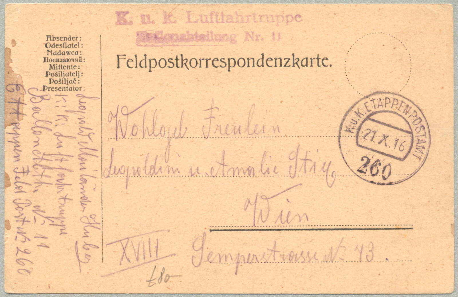 1916, field post card, from Austria-Hungary to Vienna, sent by K.U.K. LUFTFAHRTRUPPE BALLONABTEILUNG NR. 11, endorsed by K.U.K. ETAPPENPOSTAMT 260 21.X.16 handstamp, handwritten military correspondence dated October 20, 1916, rare World