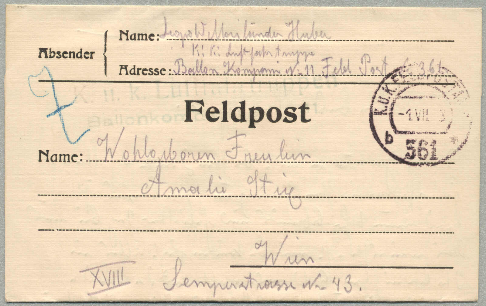 1918, Field post cover, from Austria-Hungary to Vienna, sent by K.U.K. LUFTFAHRTRUPPEN BALLONKOMPAGNIE NR. 11, endorsed by K.U.K. FELDPOST 561 4.VII.18 handstamp, green unit marking, likely posted from Italy, rare World War I