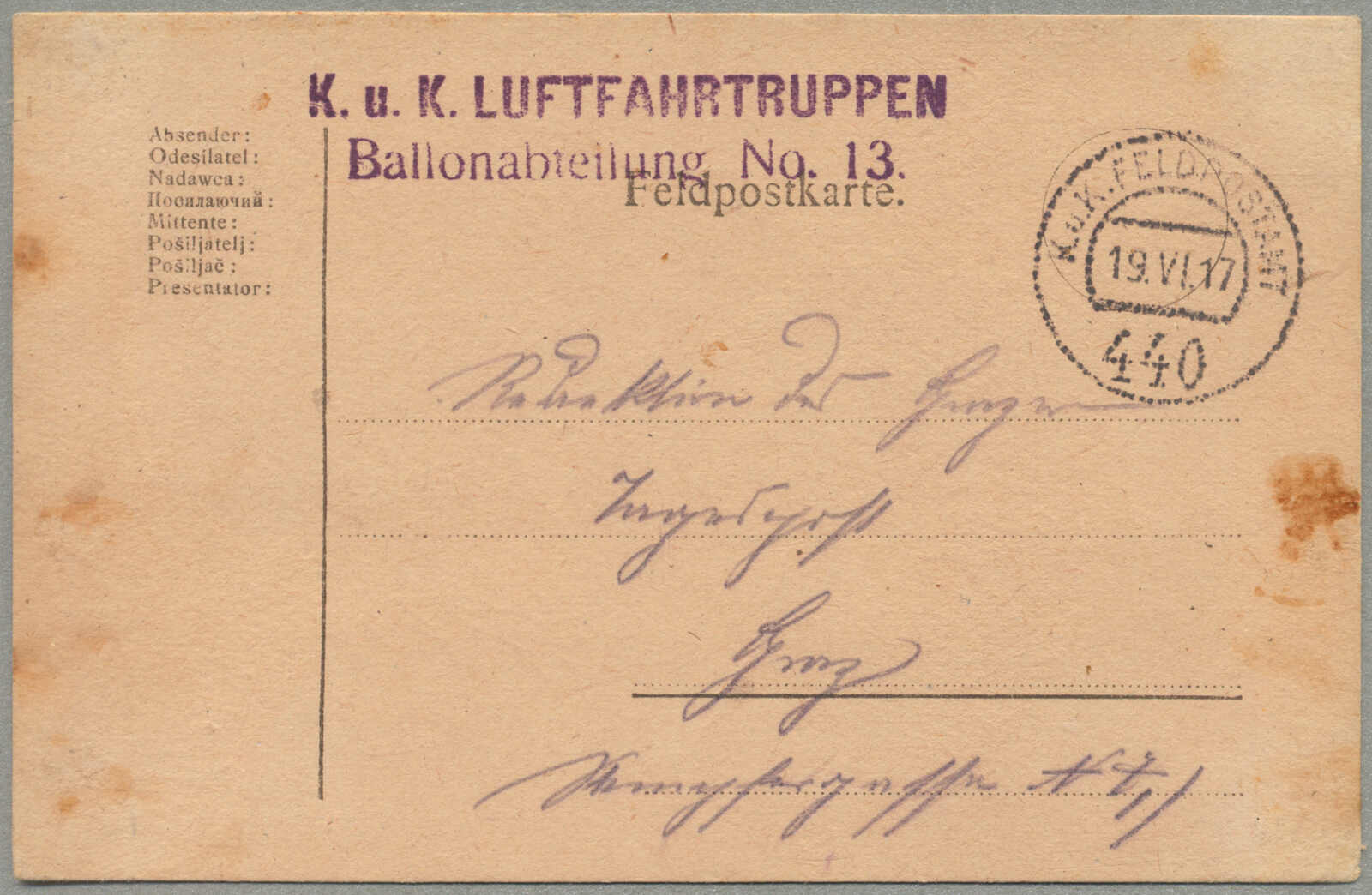 1917, Field post card, from Austria-Hungary to Graz, sent by K.U.K. LUFTFAHRTRUPPEN BALLONABTEILUNG NR. 13, endorsed by K.U.K. FELDPOSTAMT 440 / 19.VI.17 handstamp, handwritten military correspondence, rare World War I aviation-related