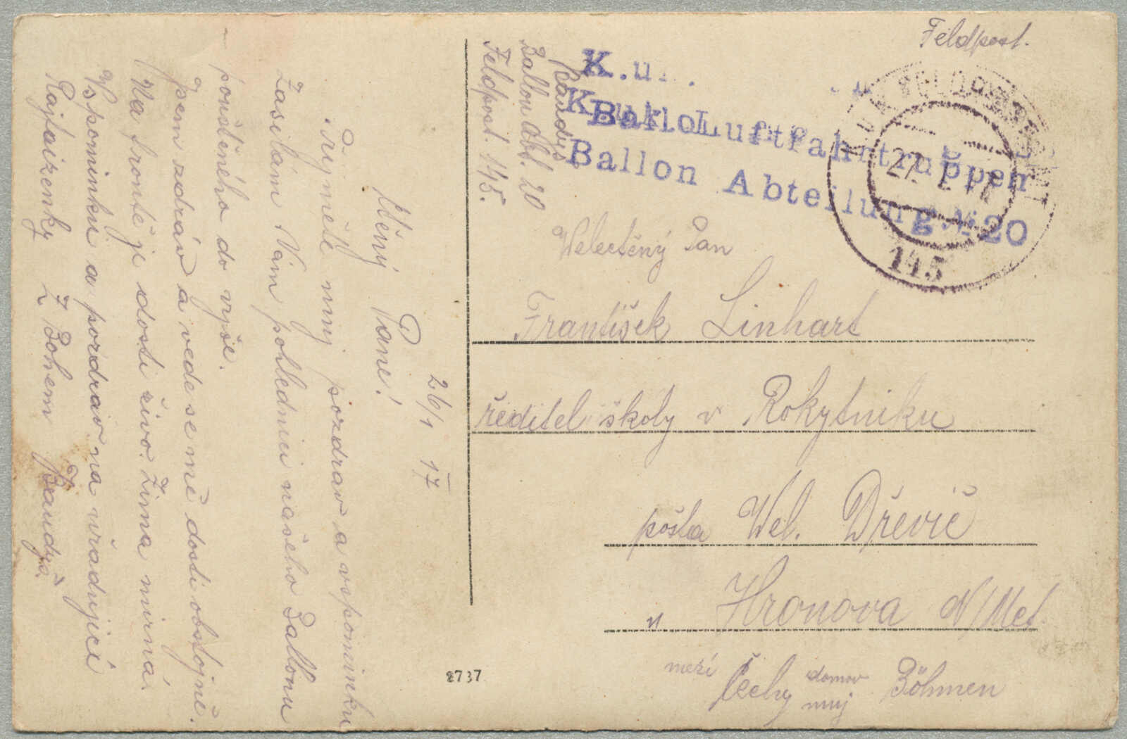 1917, Field post card, to Rokytnice, sent by K.U.K. LUFTFAHRTRUPPEN BALLON ABTEILUNG NR. 20, endorsed by K.U.K. FELDPOSTAMT 145 27.I.17 handstamp, handwritten military correspondence, scarce World War I aviation-related postal history,