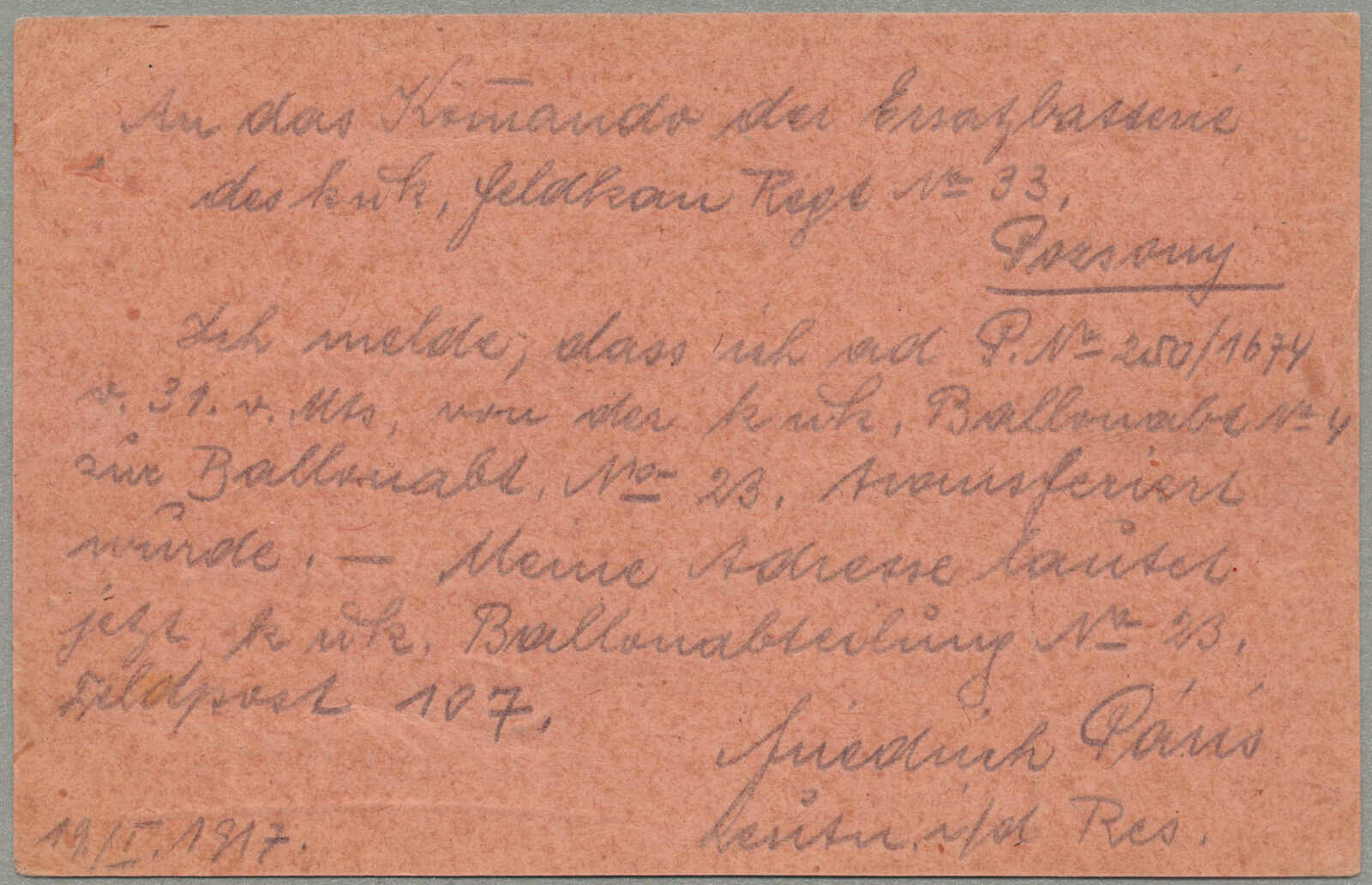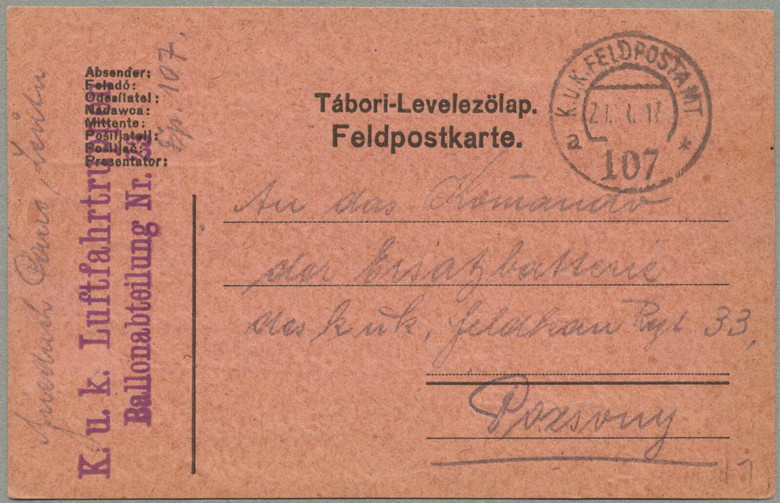 1917, Field post card, from Austria-Hungary to Pressburg, sent by K.U.K. LUFTFAHRTRUPPEN BALLONABTEILUNG NR. 23, endorsed by K.U.K. FELDPOSTAMT 107 / 21.I.17 handstamp, Hungarian bilingual text TÁBORI LEVELEZŐLAP / FELDPOSTKARTE,